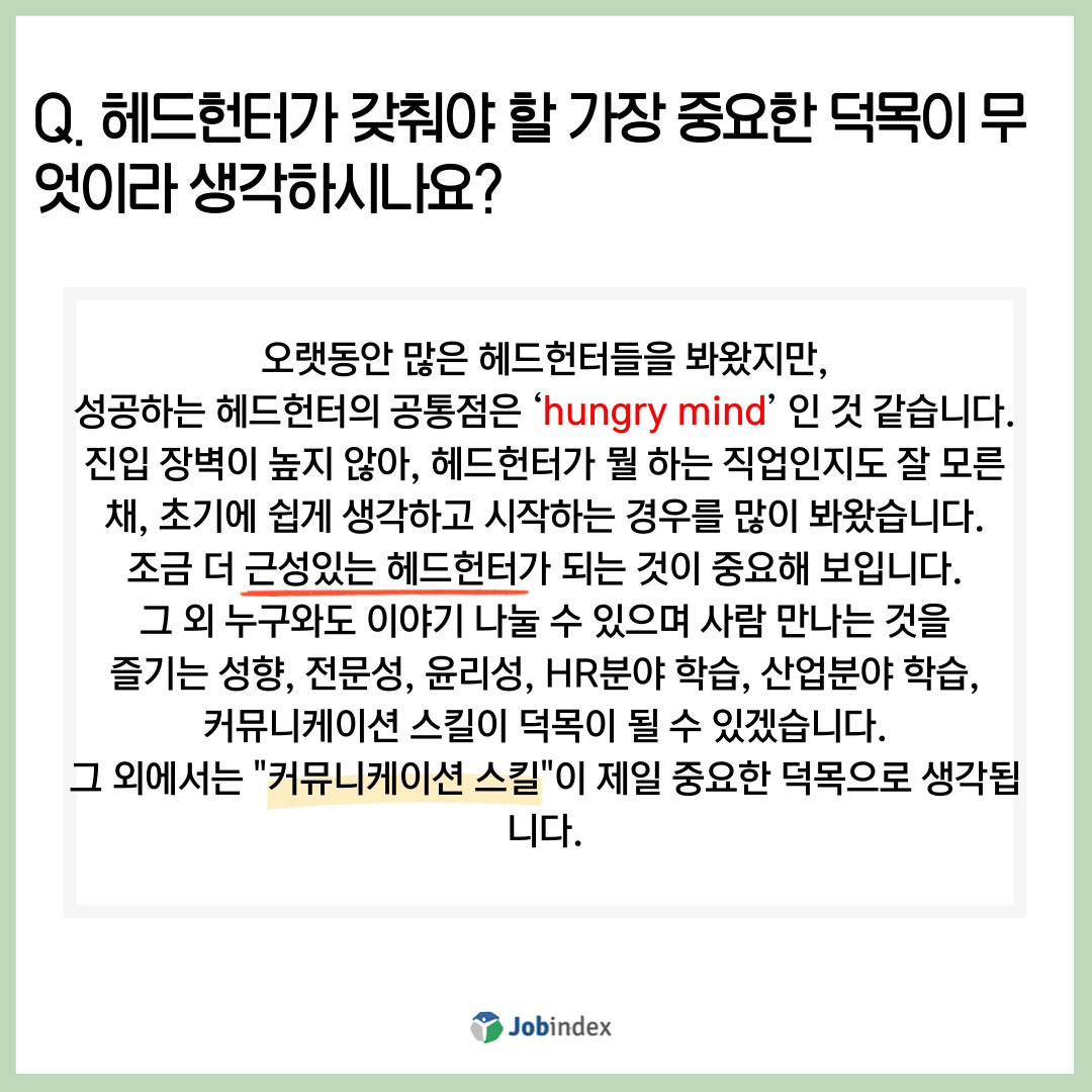 Q. 헤드헌터가 갖춰야 할 가장 중요한 덕목이 무엇이라 생각하시나요?