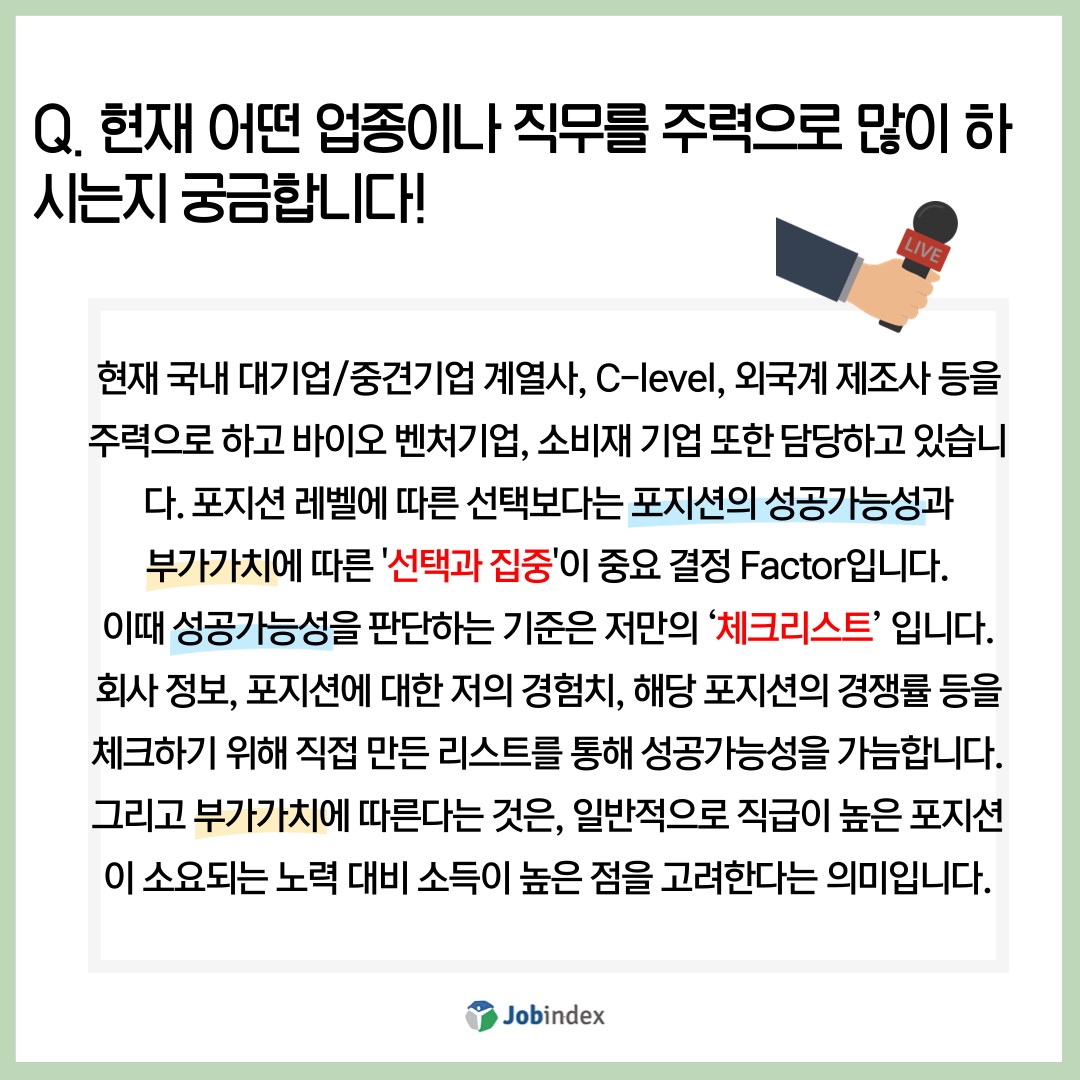 제가 가장 잘 할 수 있는 분야나 프로젝트를 선택하는 것이 최우선입니다. 물론 헤드헌팅 업을 초기에는 다양한 경험을 해보는 것이 좋지만 평균 3년정도 경험이 있다면 잘하는 분야를 선택하시는게 좋아요.