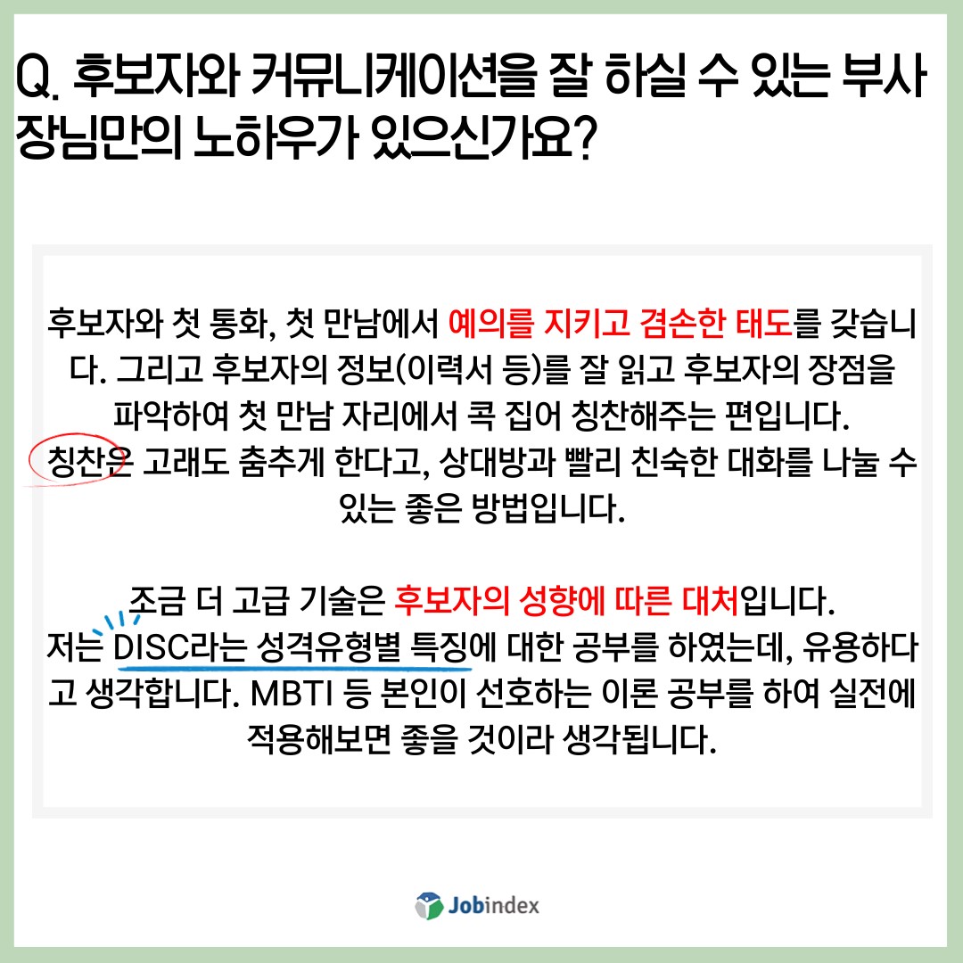 Q. 후보자와 커뮤니케이션을 잘 하실 수 있는 부사장님만의 노하우가 있으신가요?