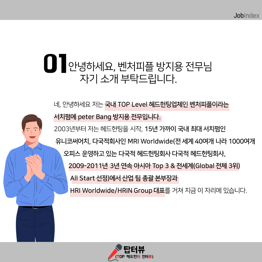- 네, 안녕하세요 저는 국내 TOP Level 헤드헌팅업체인 벤처피플이라는 서치펌에 peter Bang 방지용 전무입니다. 2003년부터 저는 헤드헌팅을 시작, 15년 가까이 국내 최대 서치펌인 유니코써어치, 다국적회사인 MRI Worldwide(전 세계 40여개 나라 1000여개 오피스 운영하고 있는 다국적 헤드헌팅회사 다국적 헤드헌팅회사, 2009-2011년 3년 연속 아시아 Top 3 & 전세계(Global 전체 3위 All Start 선정)에서 산업 팀 총괄 본부장과 HRI Worldwide/HRIN Group 대표를 거쳐 지금 이 자리에 있습니다.