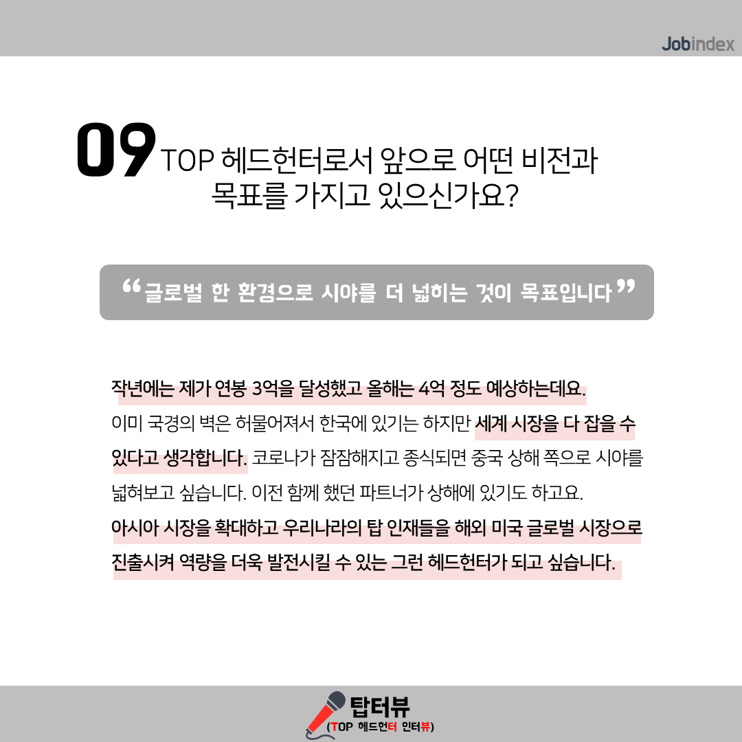- 작년에는 제가 연봉 3억을 달성했고 올해는 4억 정도 예상하는데요. 이미 국경의 벽은 허물어져서 한국에 있기는 하지만 세계 시장을 다 잡을 수 있다고 생각합니다. 코로나가 잠잠해지고 종식되면 중국 상해 쪽으로 시야를 넓혀보고 싶습니다. 이전 함께 했던 파트너가 상해에 있기도 하고요. 아시아 시장을 확대하고 우리나라의 탑 인재들을 해외 미국 글로벌 시장으로 진출시켜 역량을 더욱 발전시킬 수 있는 그런 헤드헌터가 되고 싶습니다.