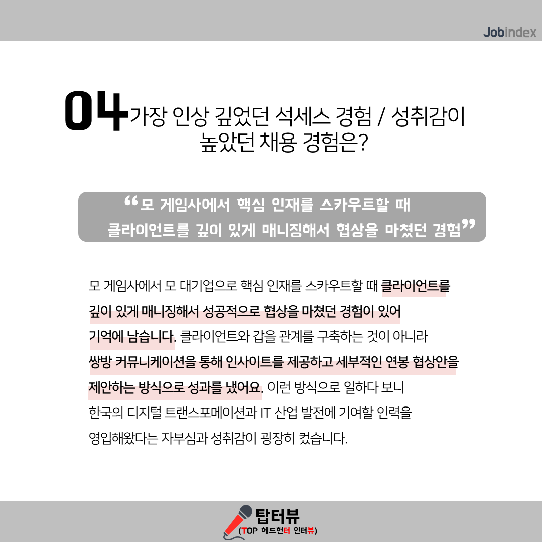 - 모 게임사에서 모 대기업으로 핵심 인재를 스카우트할 때 클라이언트를 깊이 있게 매니징해서 성공적으로 협상을 마쳤던 경험이 있어 기억에 남습니다. 클라이언트와 갑을 관계를 구축하는 것이 아니라 쌍방 커뮤니케이션을 통해 인사이트를 제공하고 세부적인 연봉 협상안을 제안하는 방식으로 성과를 냈어요. 이런 방식으로 일하다 보니 한국의 디지털 트랜스포메이션과 IT 산업 발전에 기여할 인력을 영입해왔다는 자부심과 성취감이 굉장히 컸습니다.
