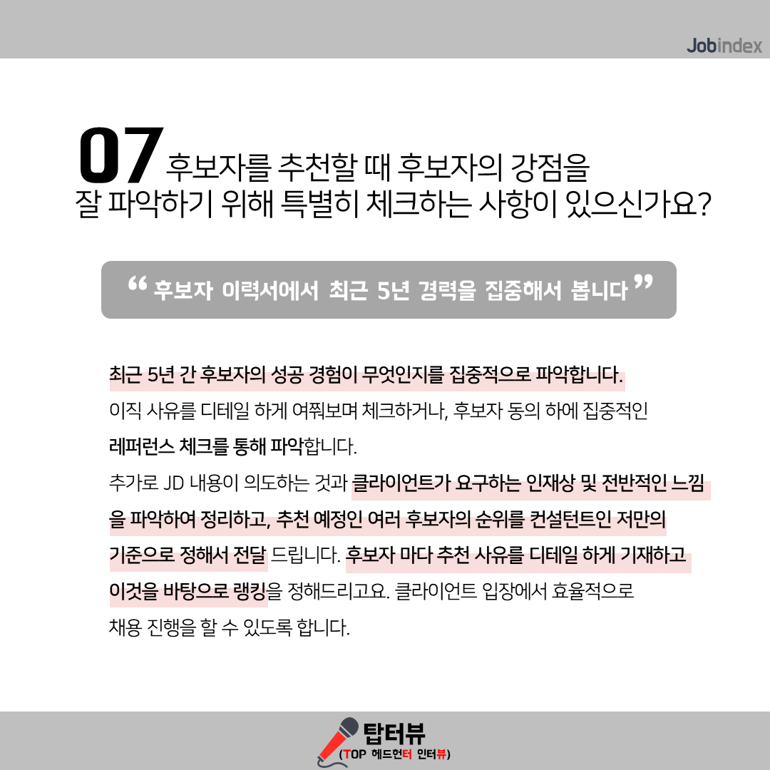 - 최근 5년 간 후보자의 성공 경험이 무엇인지를 집중적으로 파악합니다. 이직 사유를 디테일 하게 여쭤보며 체크하거나, 후보자 동의 하에 집중적인 레퍼런스 체크를 통해 파악합니다. 추가로 JD 내용이 의도하는 것과 클라이언트가 요구하는 인재상 및 전반적인 느낌을 파악하여 정리하고, 추천 예정인 여러 후보자의 순위를 컨설턴트인 저만의 기준으로 정해서 전달 드립니다. 후보자 마다 추천 사유를 디테일 하게 기재하고 이것을 바탕으로 랭킹을 정해드리고요. 클라이언트 입장에서 효율적으로 채용 진행을 할 수 있도록 합니다.