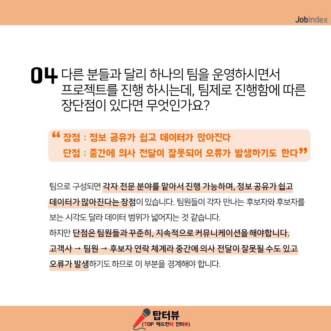- 팀으로 구성되면 각자 전문 분야를 맡아서 진행 가능하며, 정보 공유가 쉽고 데이터가 많아진다는 장점이 있습니다. 팀원들이 각자 만나는 후보자와 후보자를 보는 시각도 달라 데이터 범위가 넓어지는 것 같습니다. 하지만 단점은 팀원들과 꾸준히, 지속적으로 커뮤니케이션을 해야합니다. 고객사 → 팀원 → 후보자 연락 체계라 중간에 의사 전달이 잘못될 수도 있고 오류가 발생하기도 하므로 이 부분을 경계해야 합니다.