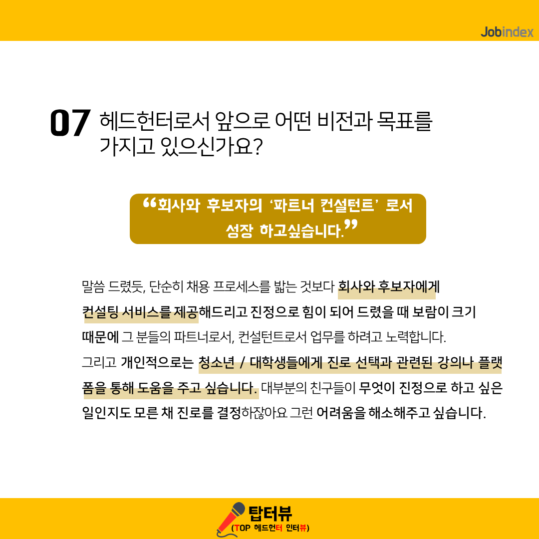 07. 헤드헌터로서 앞으로 어떤 비전과 목표를 가지고 있으신가요?