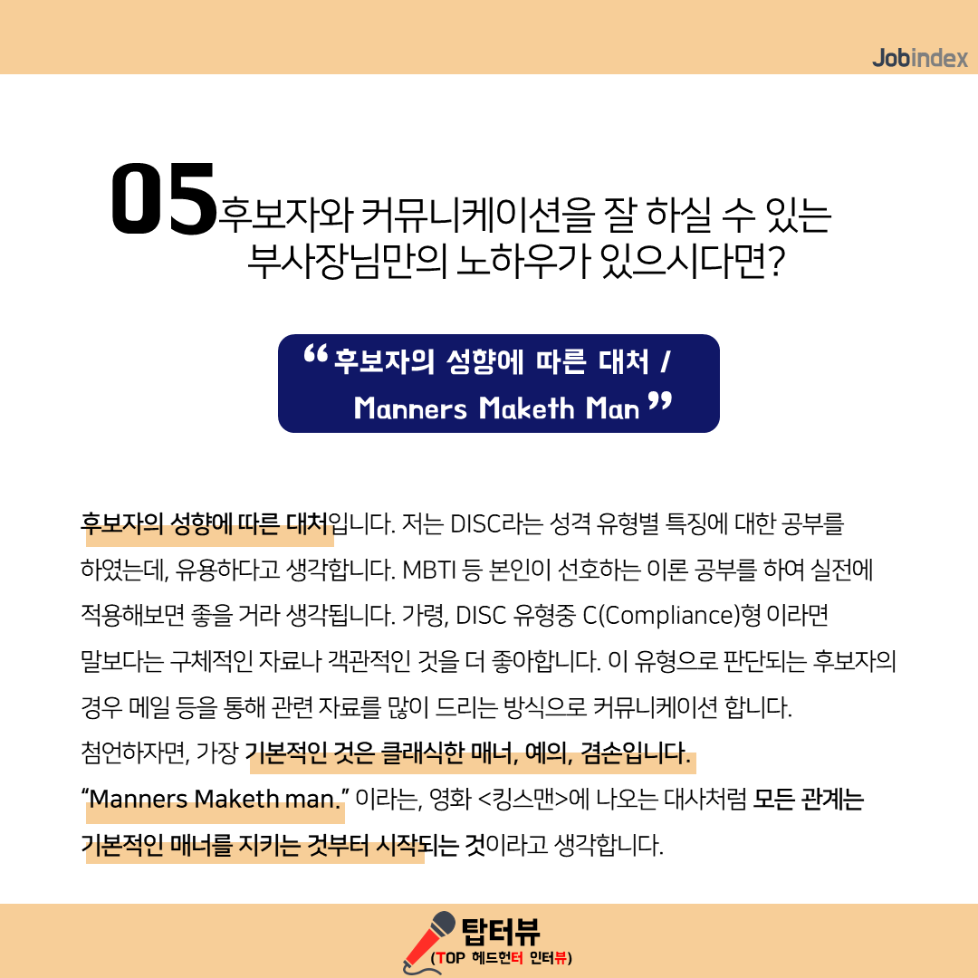 - 후보자의 성향에 따른 대처입니다. 저는 DISC라는 성격 유형별 특징에 대한 공부를 하였는데, 유용하다고 생각합니다. MBTI 등 본인이 선호하는 이론 공부를 하여 실전에 적용해보면 좋을 거라 생각됩니다. 가령, DISC 유형중 C(Compliance)형 이라면 말보다는 구체적인 자료나 객관적인 것을 더 좋아합니다. 이 유형으로 판단되는 후보자의 경우 메일 등을 통해 관련 자료를 많이 드리는 방식으로 커뮤니케이션 합니다. 첨언하자면, 가장 기본적인 것은 클래식한 매너, 예의, 겸손입니다. “Manners Maketh man.” 이라는, 영화 <킹스맨>에 나오는 대사처럼 모든 관계는 기본적인 매너를 지키는 것부터 시작되는 것이라고 생각합니다.