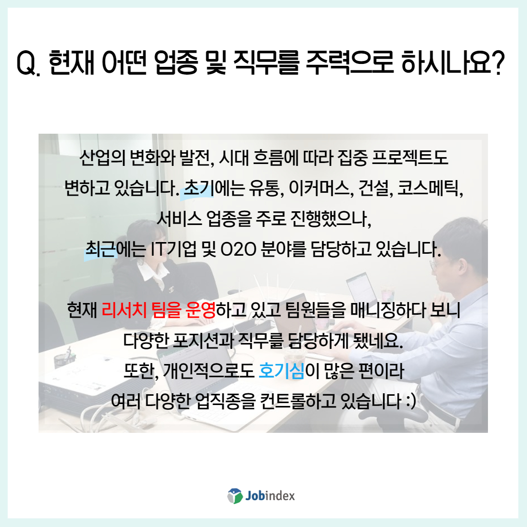 산업의 변화와 발전, 시대 흐름에 따라 집중 프로젝트도 변하고 있습니다. 초기에는 유통, 이커머스, 건설, 코스메틱, 서비스 업종을 주로 진행했으나, 최근에는 IT기업 및 O2O 분야를 담당하고 있습니다.