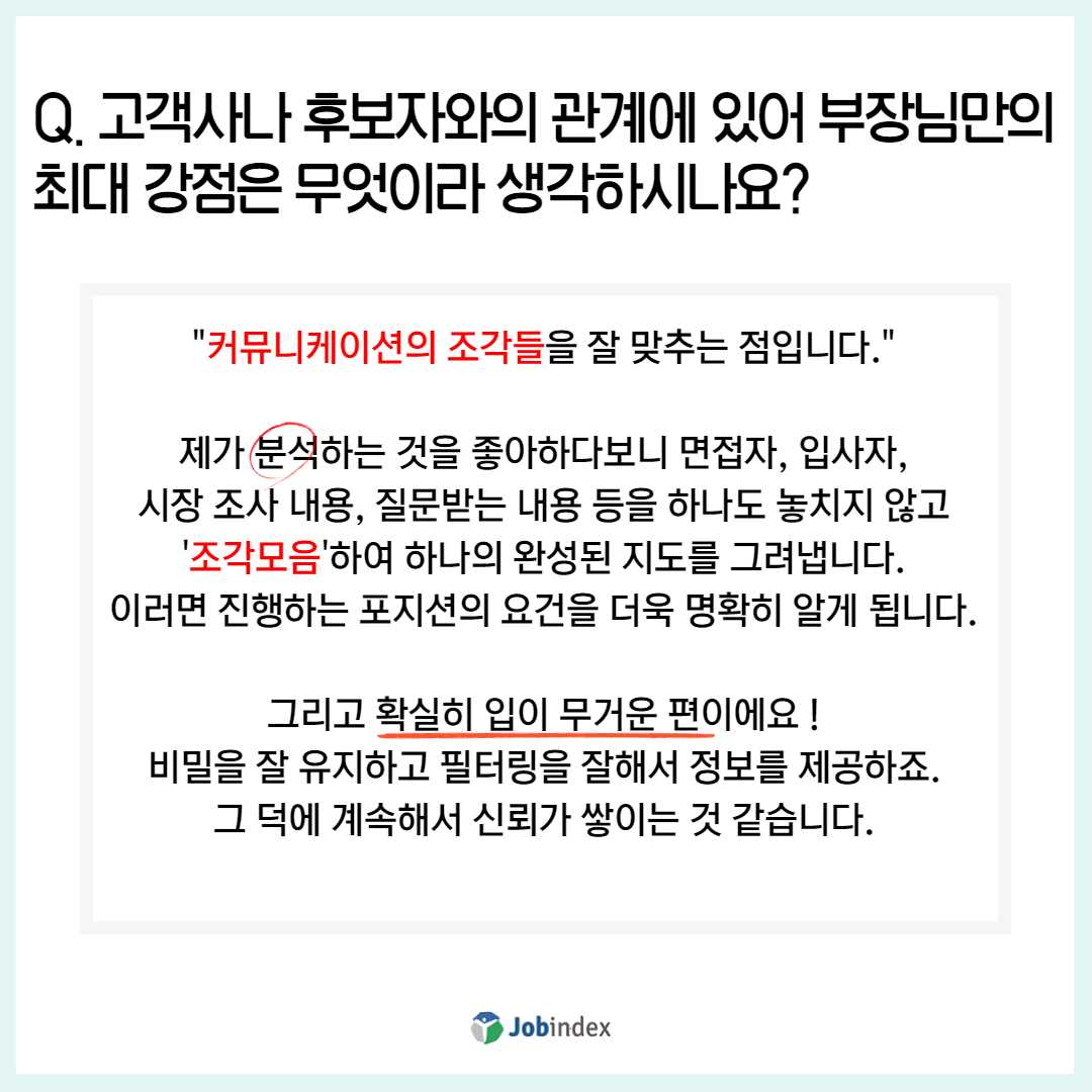 Q. 고객사나 후보자와의 관계에 있어 부장님만의 최대 강점은 무엇이라 생각하시나요?