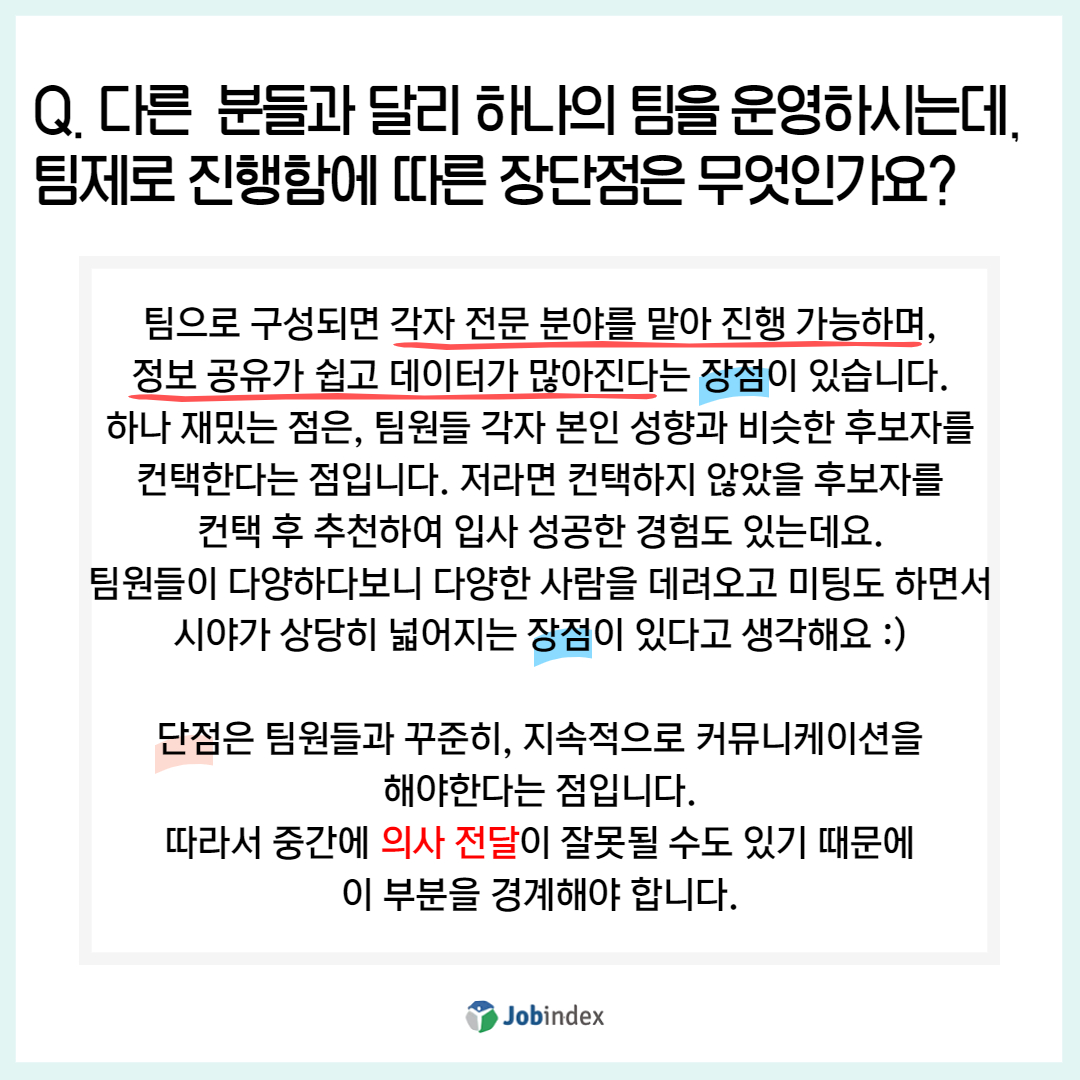 Q. 다른 분들과 달리 하나의 팀을 운영하시는데, 팀제로 진행함에 따른 장단점은 무엇인가요?
