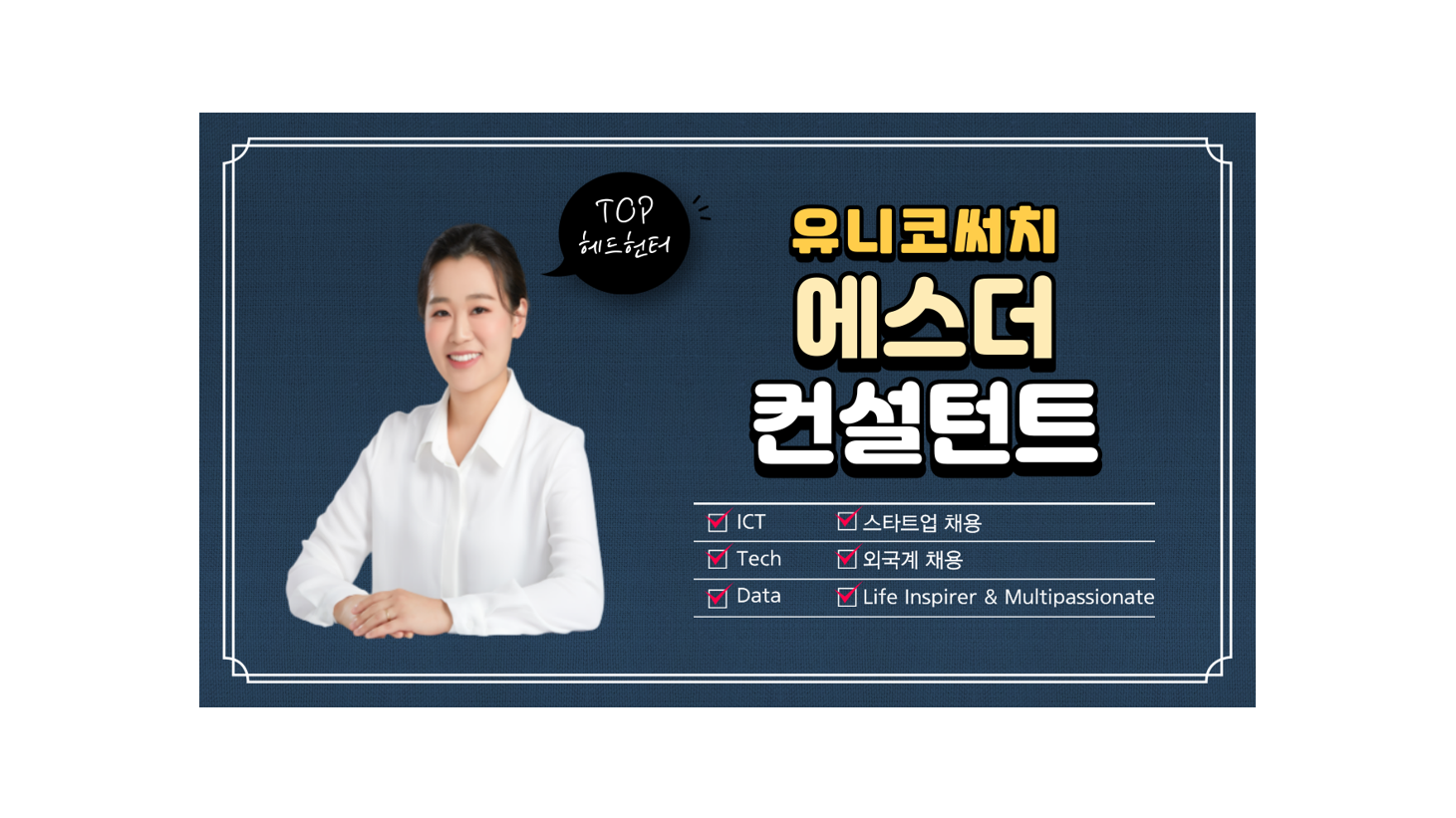 유니코써치 에스더 과장은 IT, ICT, Tech, 스타트업(신규 비즈니스), 외국계 분야에서 전문성을 가지고 다양한 성공 경험을 이뤄온 컨설턴트이다. 여러 직무에서의 필드 경험과 외국 생활 경험으로 영어 또한 능숙한 것이 큰 장점이다.