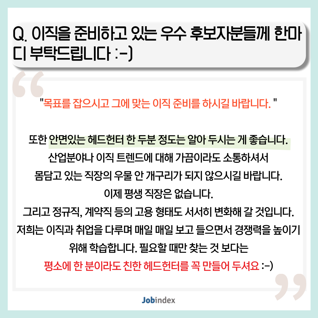 Q. 이직을 준비하고 있는 우수 후보자분들께 한마디 부탁드립니다 :-)