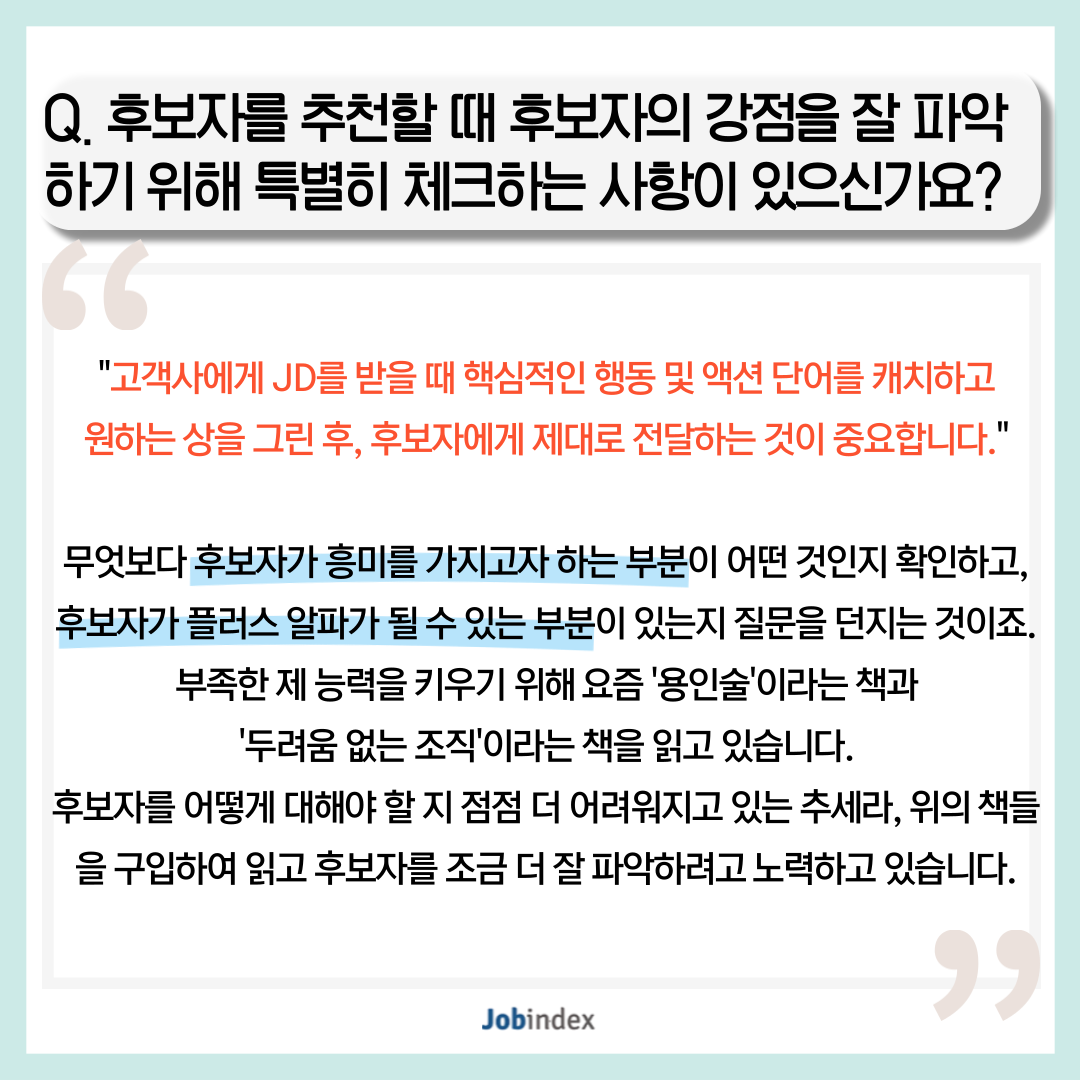 Q. 후보자를 추천할 때 후보자의 강점을 잘 파악하기 위해 특별히 체크하는 사항이 있으신가요?