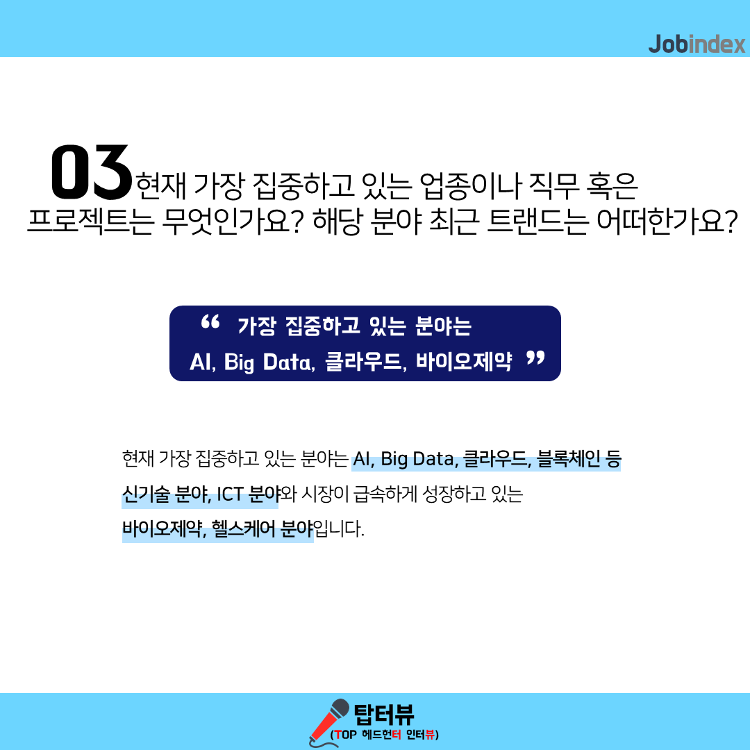 03. 현재 가장 집중하고 있는 업종이나 직무 혹은 프로젝트는 무엇인가요? 해당 분야 최근 트랜드는 어떠한가요?