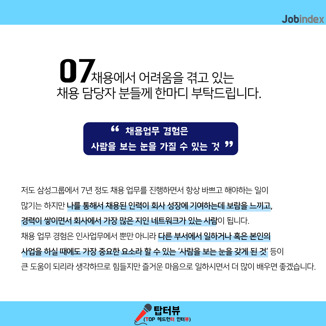 07. 채용에서 어려움을 겪고 있는 채용 담당자 분들께 한마디 부탁드립니다.