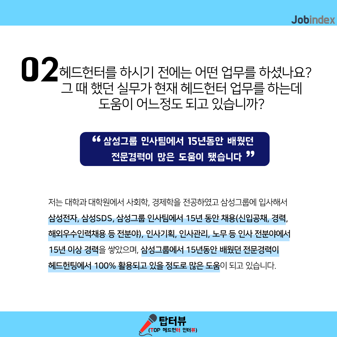 02. 헤드헌터를 하시기 전에는 어떤 업무를 하셨나요? 그 때 했던 실무가 현재 헤드헌터 업무를 하는데 도움이 어느정도 되고 있습니까?