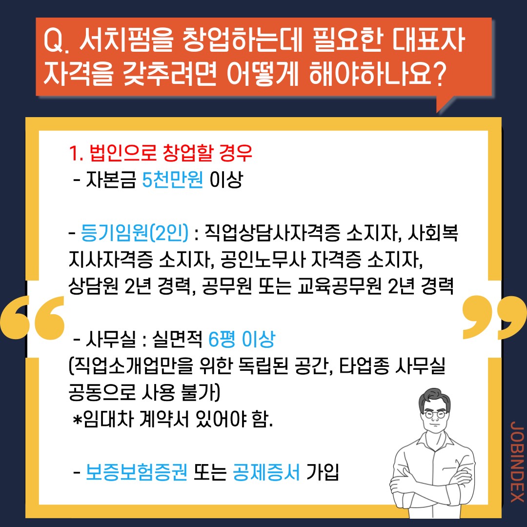 Q. 서치펌을 창업하는데 필요한 대표자 자격을 갖추려면 어떻게 해야하나요?