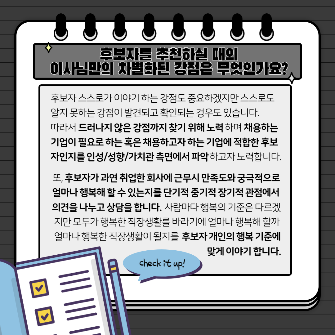 후보자를 추천하실 때의 이사님만의 차별화된 강점은 무엇인가요?