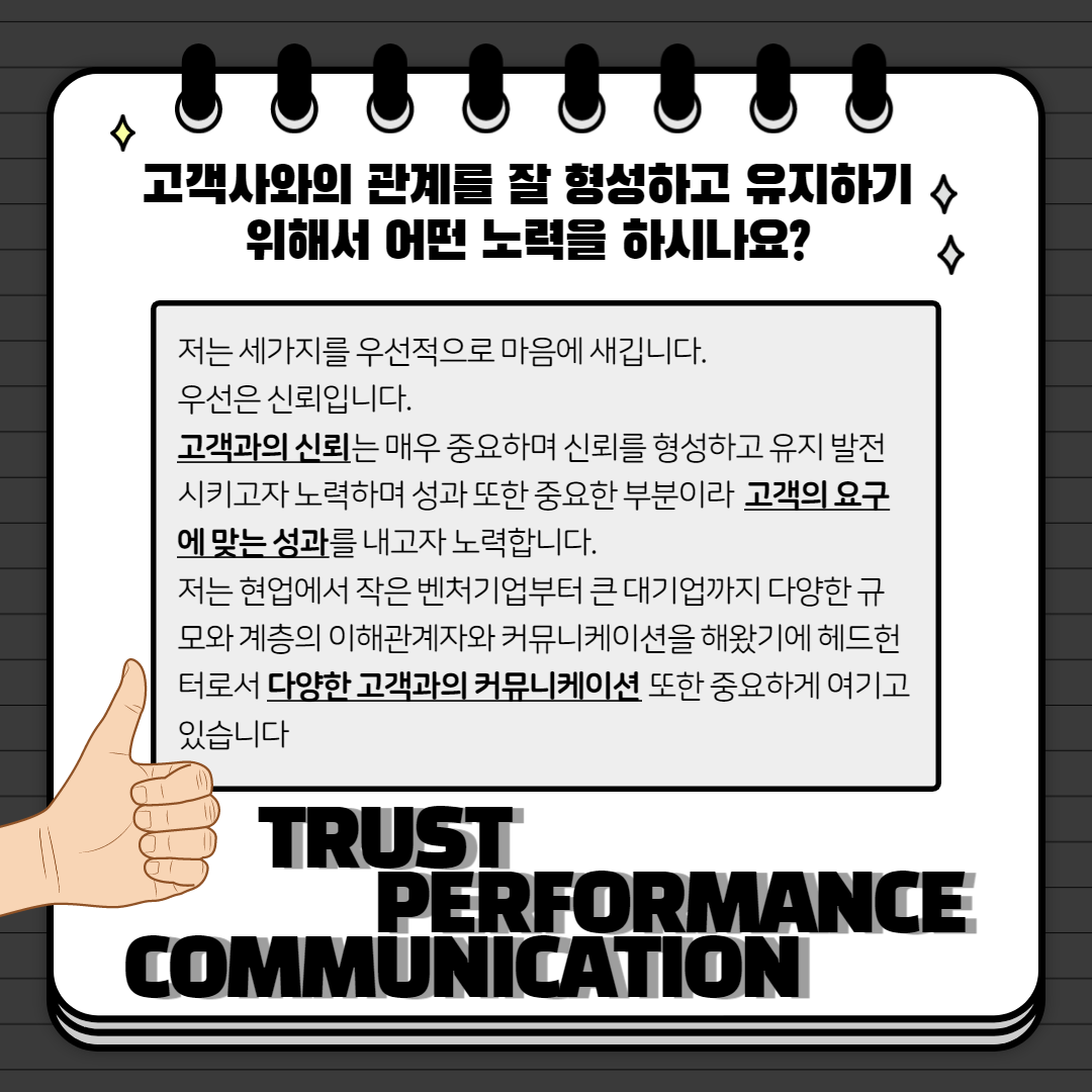 저는 현업에서 작은 벤처기업부터 큰 대기업까지 다양한 규모와 계층의 이해관계자와 커뮤니케이션을 해왔기에 헤드헌터로서 다양한 고객과의 커뮤니케이션 또한 중요하게 여기고 있습니다