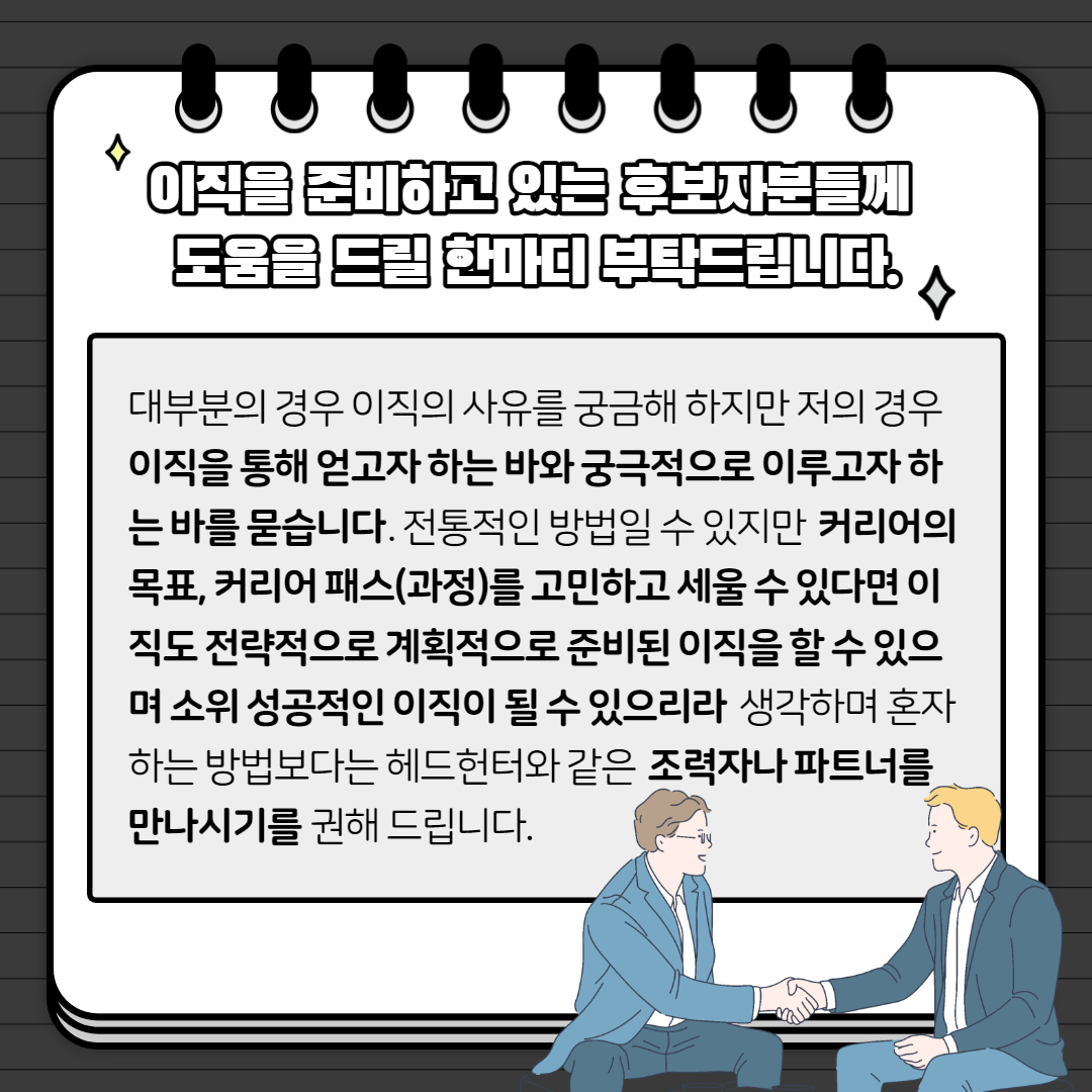 대부분의 경우 이직의 사유를 궁금해 하지만 저의 경우 이직을 통해 얻고자 하는 바와 궁극적으로 이루고자 하는 바를 묻습니다. 전통적인 방법일 수 있지만 커리어의 목표, 커리어 패스(과정)를 고민하고 세울 수 있다면 이직도 전략적으로 계획적으로 준비된 이직을 할 수 있으며 소위 성공적인 이직이 될 수 있으리라 생각하며 혼자 하는 방법보다는 헤드헌터와 같은 조력자나 파트너를 만나시기를 권해 드립니다.