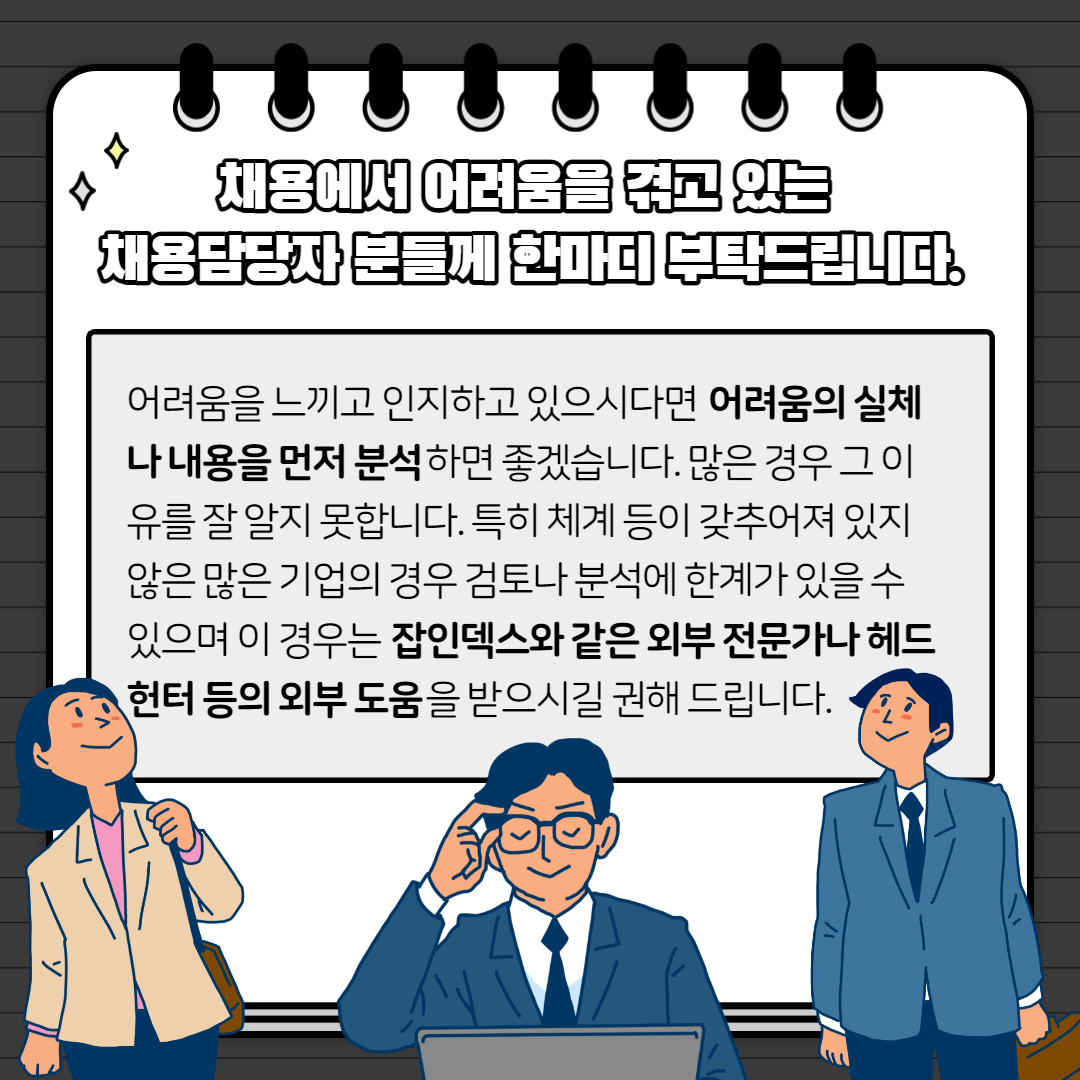 어려움을 느끼고 인지하고 있으시다면 어려움의 실체나 내용을 먼저 분석하면 좋겠습니다. 많은 경우 그 이유를 잘 알지 못합니다. 특히 체계 등이 갖추어져 있지 않은 많은 기업의 경우 검토나 분석에 한계가 있을 수 있으며 이 경우는 잡인덱스와 같은 외부 전문가나 헤드헌터 등의 외부 도움을 받으시길 권해 드립니다.
