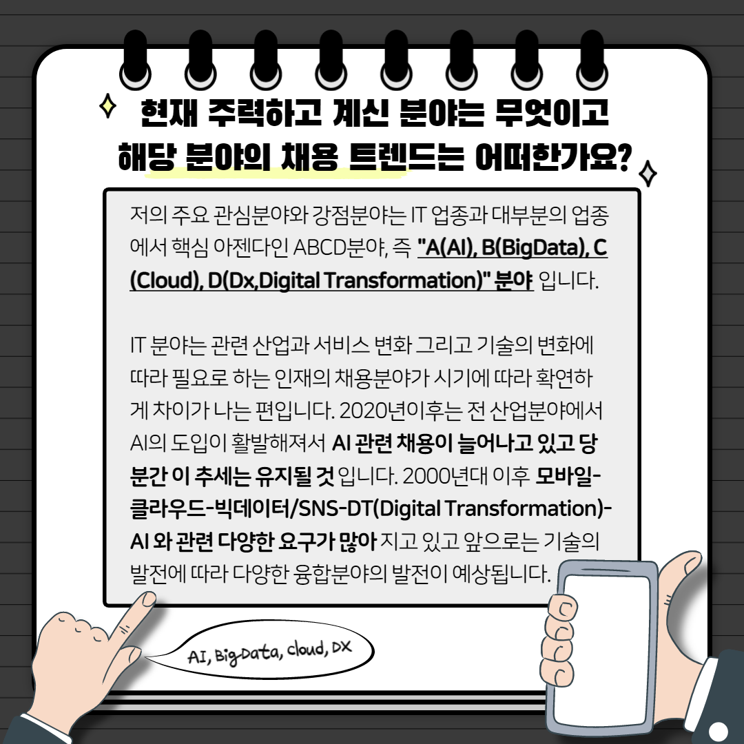 저의 주요 관심분야와 강점분야는 IT 업종과 대부분의 업종에서 핵심 아젠다인 ABCD분야, 즉 "A(AI), B(BigData), C(Cloud), D(Dx,Digital Transformation)" 분야 입니다.