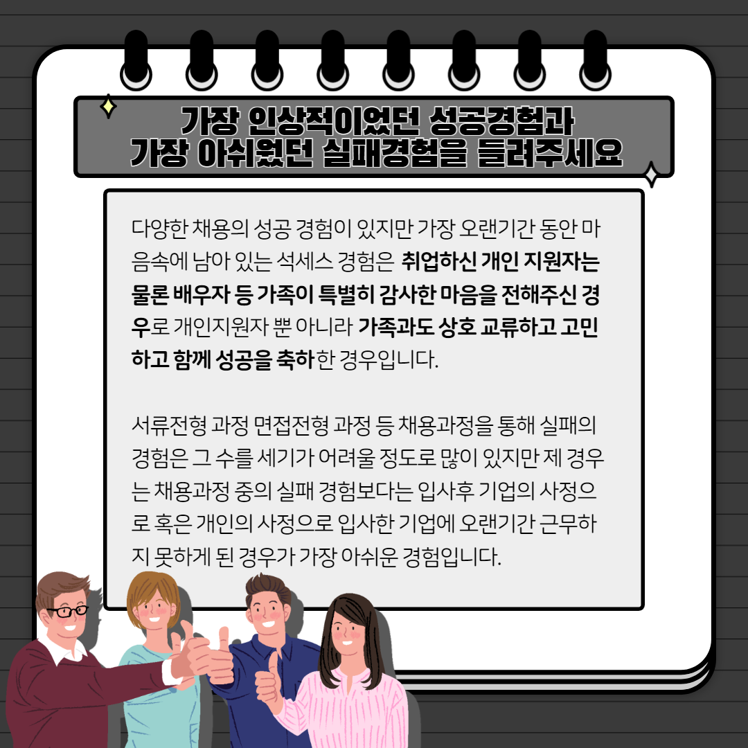 다양한 채용의 성공 경험이 있지만 가장 오랜기간 동안 마음속에 남아 있는 석세스 경험은 취업하신 개인 지원자는 물론 배우자 등 가족이 특별히 감사한 마음을 전해주신 경우로 개인지원자 뿐 아니라 가족과도 상호 교류하고 고민하고 함께 성공을 축하한 경우입니다.