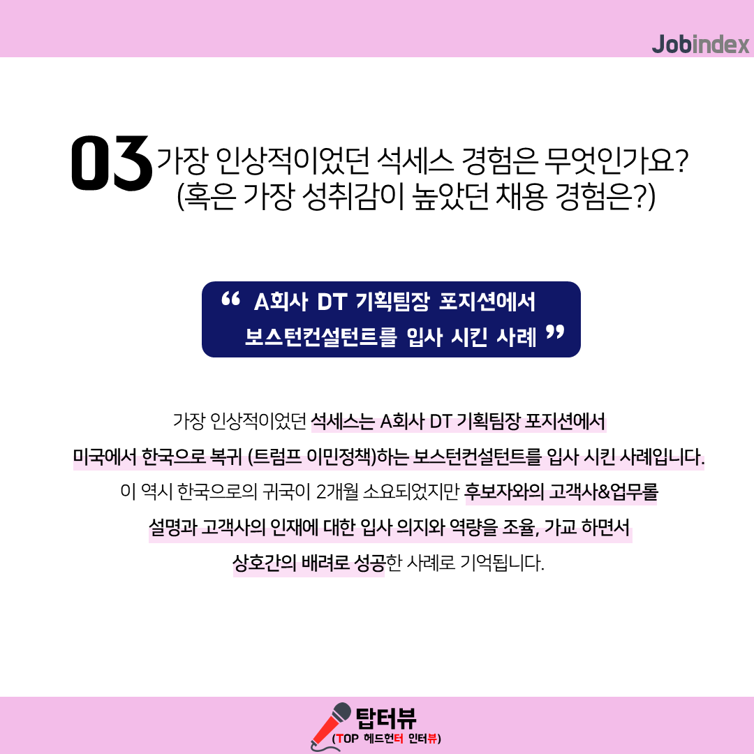 가장 인상적이었던 석세스는 A회사 DT 기획팀장 포지션에서 미국에서 한국으로 복귀 (트럼프 이민정책)하는 보스턴컨설턴트를 입사 시킨 사례입니다. 이 역시 한국으로의 귀국이 2개월 소요되었지만 후보자와의 고객사&업무롤 설명과 고객사의 인재에 대한 입사 의지와 역량을 조율, 가교 하면서 상호간의 배려로 성공한 사례로 기억됩니다.