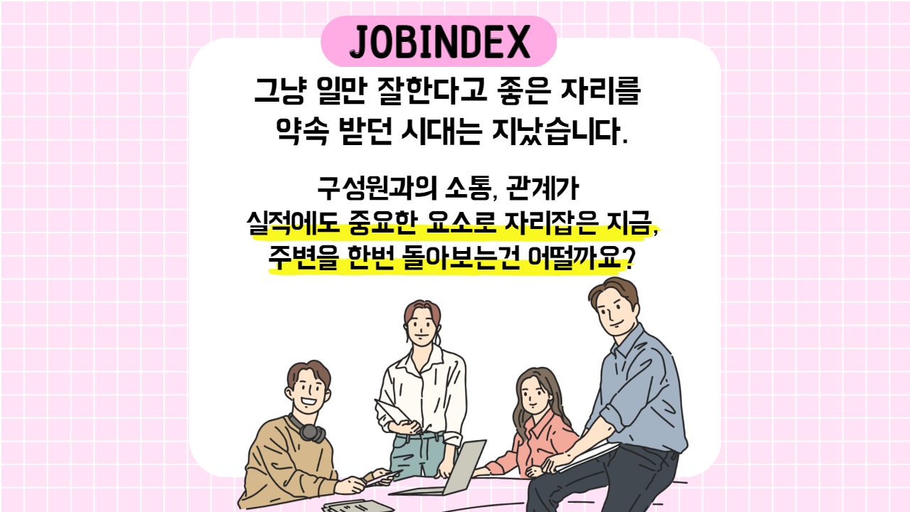 그냥 일만 잘한다고 좋은 자리를 약속 받던 시대는 지났습니다. 구성원과의 소통, 관계가 실적에도 중요한 요소로 자리잡은 지금, 주변을 한번 돌아보는 건 어떨까요?