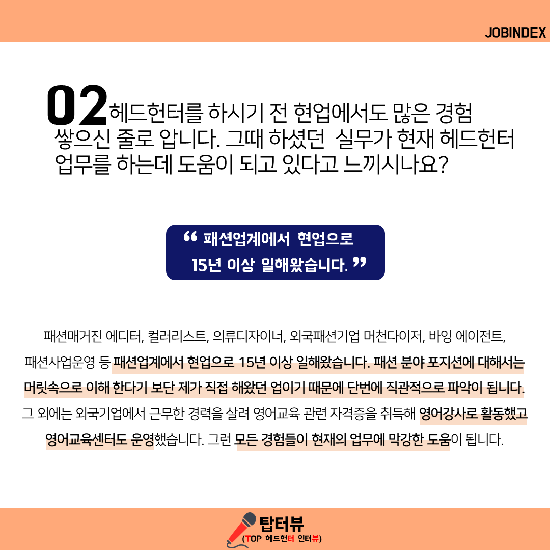 02. 헤드헌터를 하시기 전 현업에서도 많은 경험을 쌓으신 줄로 압니다. 그때 하셨던 실무가 현재 헤드헌터 업무를 하는데 도움이 되고 있다고 느끼시나요?
