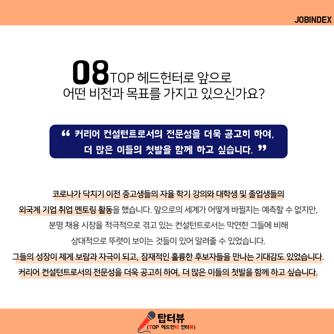 08. TOP헤드헌터로 앞으로 어떤 비전과 목표를 가지고 있으신가요?