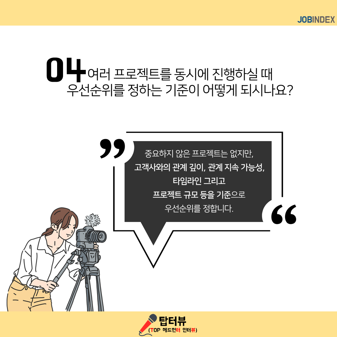 04. 여러 프로젝트를 동시에 진행하실 때 우선순위를 정하는 기준이 어떻게 되시나요?