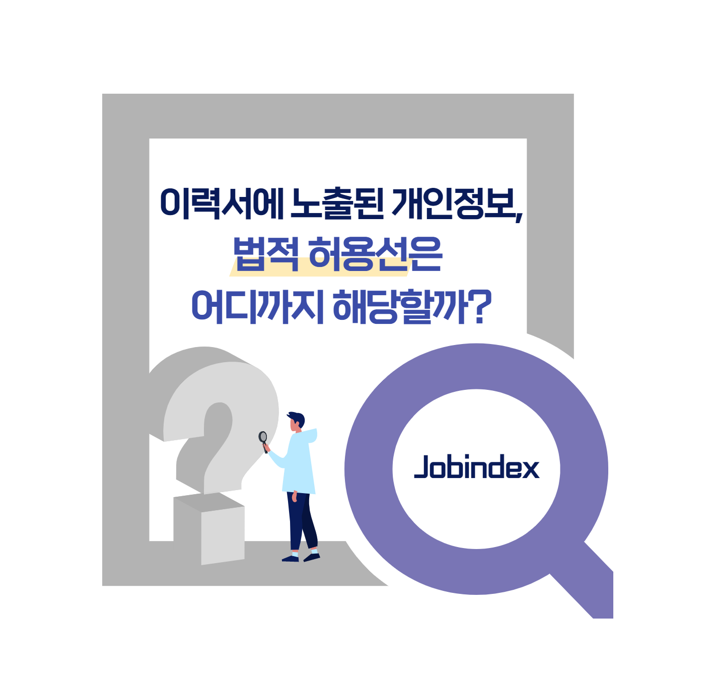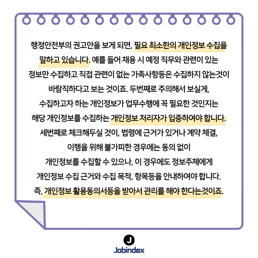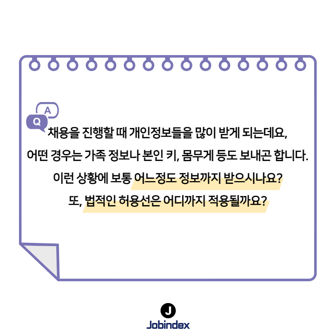 이력서의 개인정보들, 법적 허용선은 어디까지 적용될까? 8,918 0 0 채용을 진행하게 되면 수많은 이력서를 받게되는데요, 이력서에 노출된 여러 개인정보들의 법정 허용선은 어디까지 해당하는지 알고계신가요? ☞ 더 다양한 답변 보러가기 `21.04.07(updated. `21.04.08) 다음글[헤드헌터 인터뷰 콘텐츠] 코어포인트 윤영호대표 이전글[헤드헌터 인터뷰 콘텐츠] 벤처피플 박혜림 컨설턴트