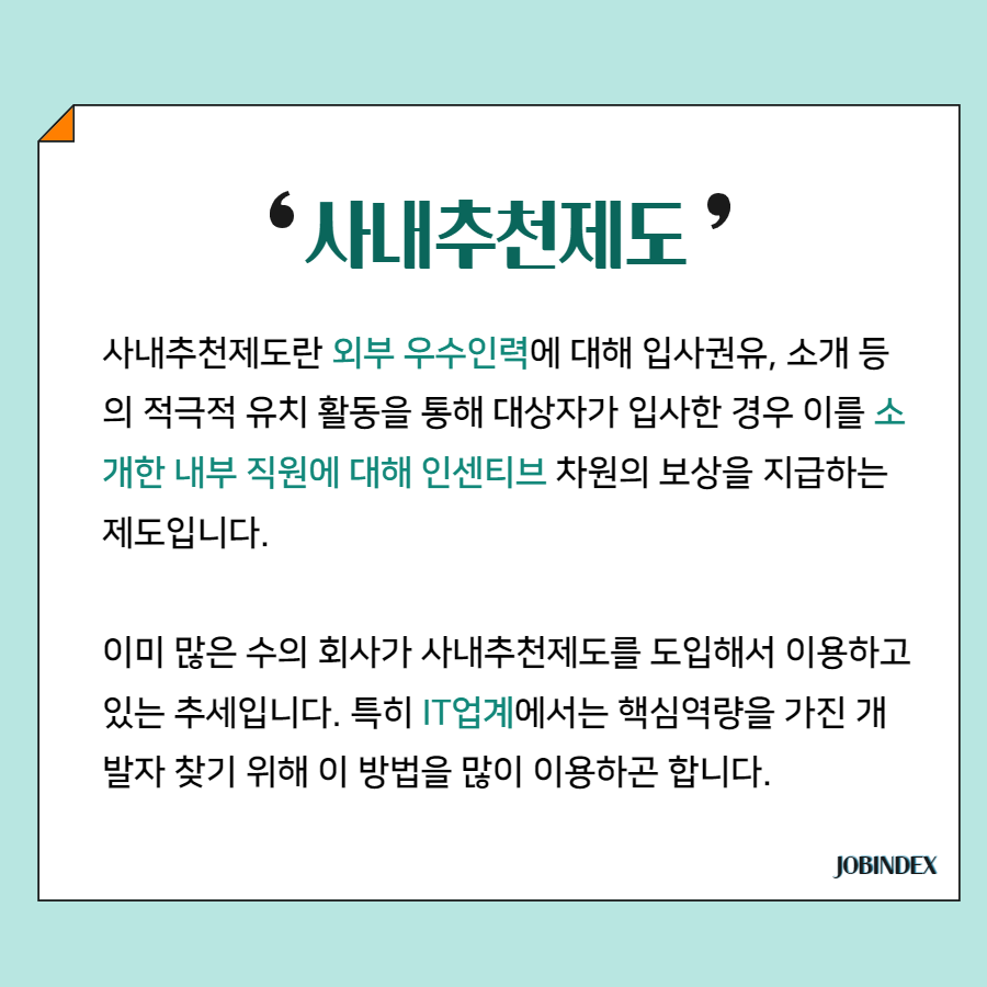 사내 추천제도는 임직원 추천제도, 종업원 공모제도, 추천 채용 등 다양하게 불리고 있습니다. 그러나, 보편적으로 활용하는 채용 방식이 아니다 보니 생소하게 생각하는 분들도 많습니다.