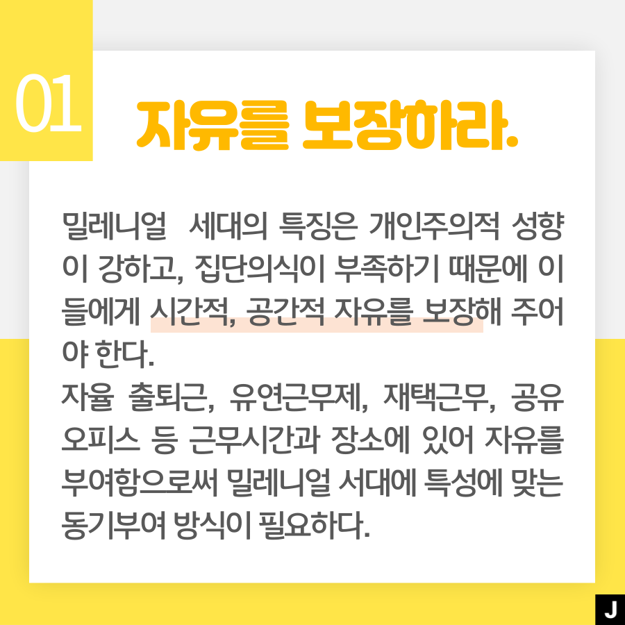 밀레니얼 세대에 대한 특징을 이해한 후, 특성에 맞는 동기부여 방법을 알아보겠습니다!