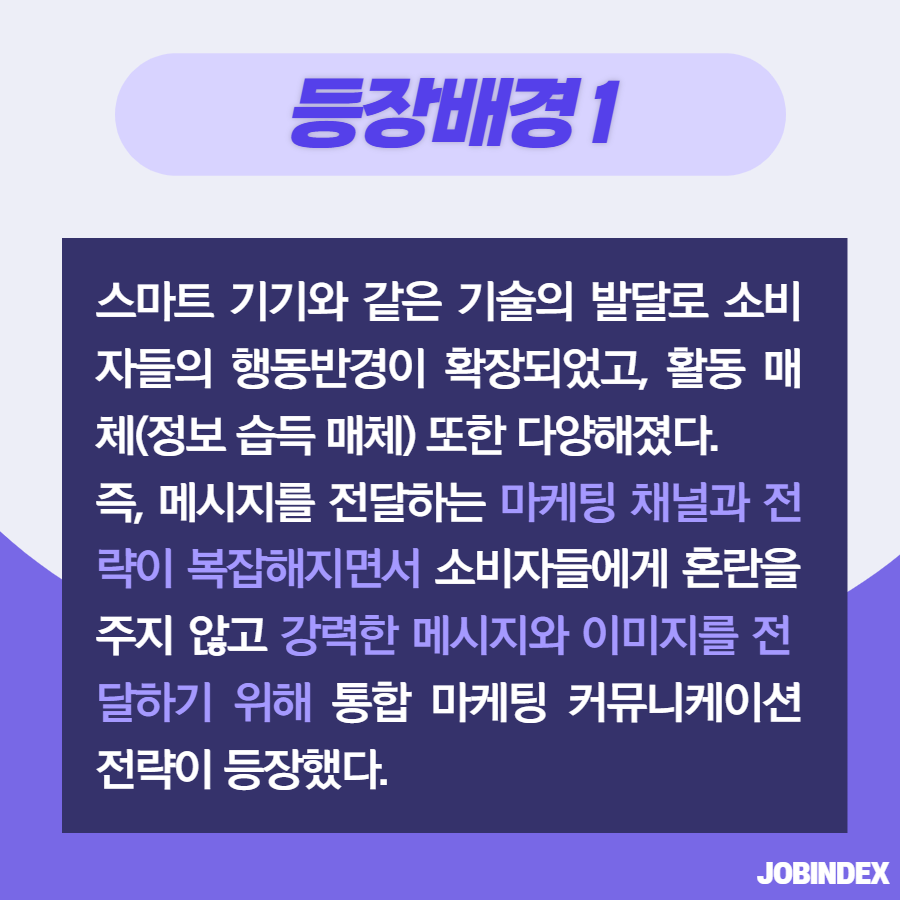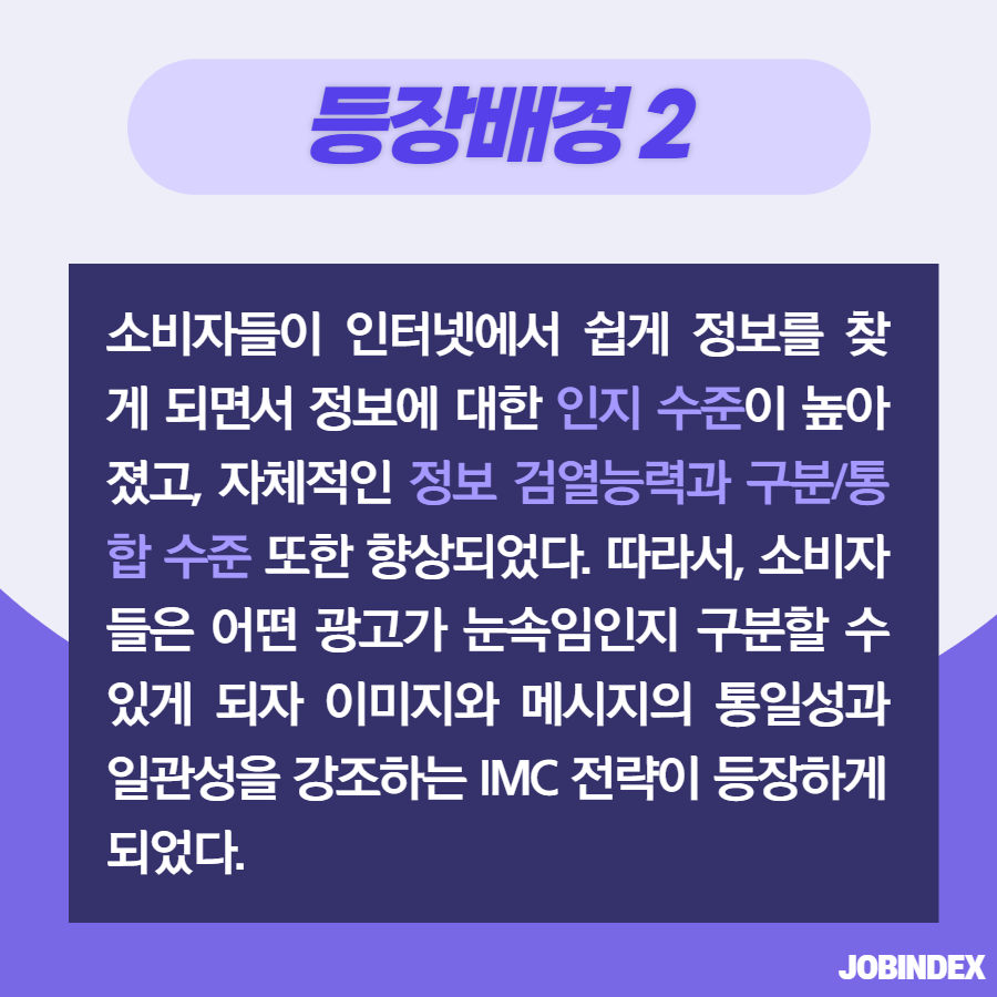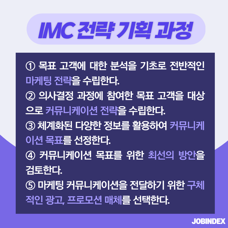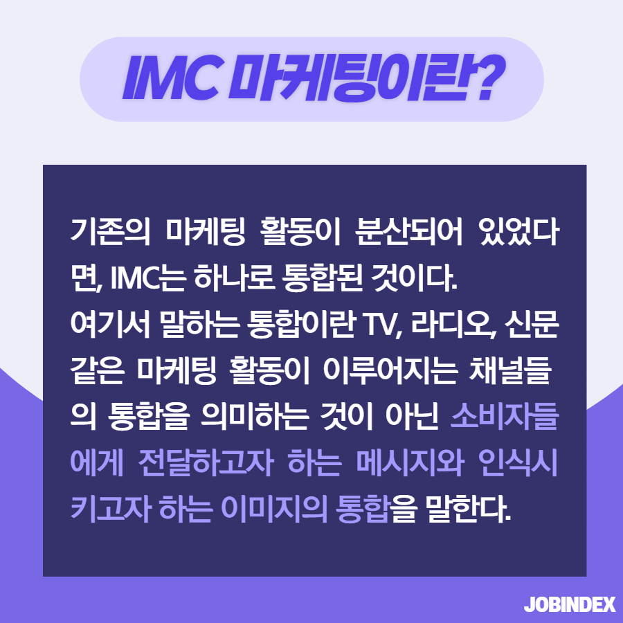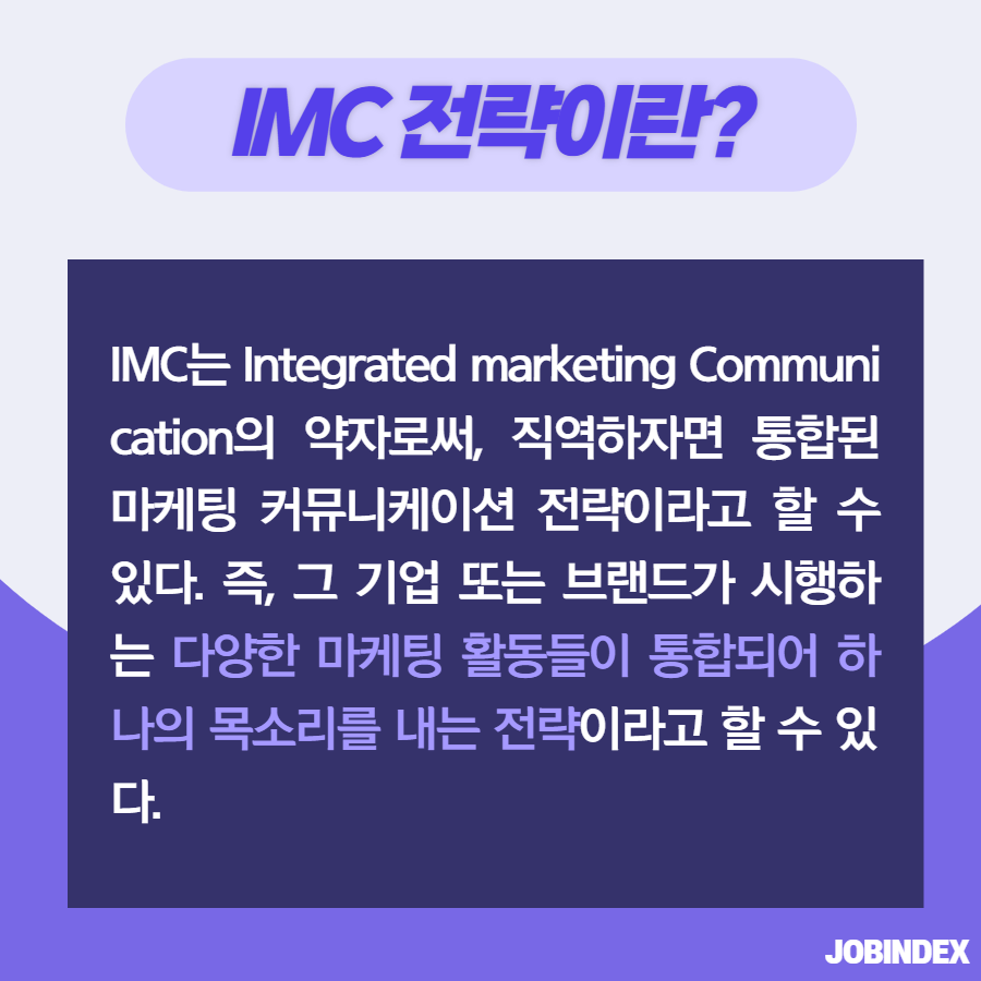 IMC 마케팅 전략이란? 7,546 1 1 마케팅에는 다양한 용어와 전략이 존재합니다. 그중에서 IMC 마케팅은 메시지와 이미지를 통합하여 하나의 목소리를 내는 것입니다. 오늘은 IMC 마케팅(전략)에 대해 알아보겠습니다! 직무별 공고를 한눈에 볼 수 있는 잡인덱스 JOBINDEX `21.06.29(updated. `21.07.19) 다음글[좋은글] 지치고 힘들 때 위로가 되는 '글배우' 힐링 글귀 이전글전기차 배터리의 유형과 유형별 탑재량은 어떻게 되나요?