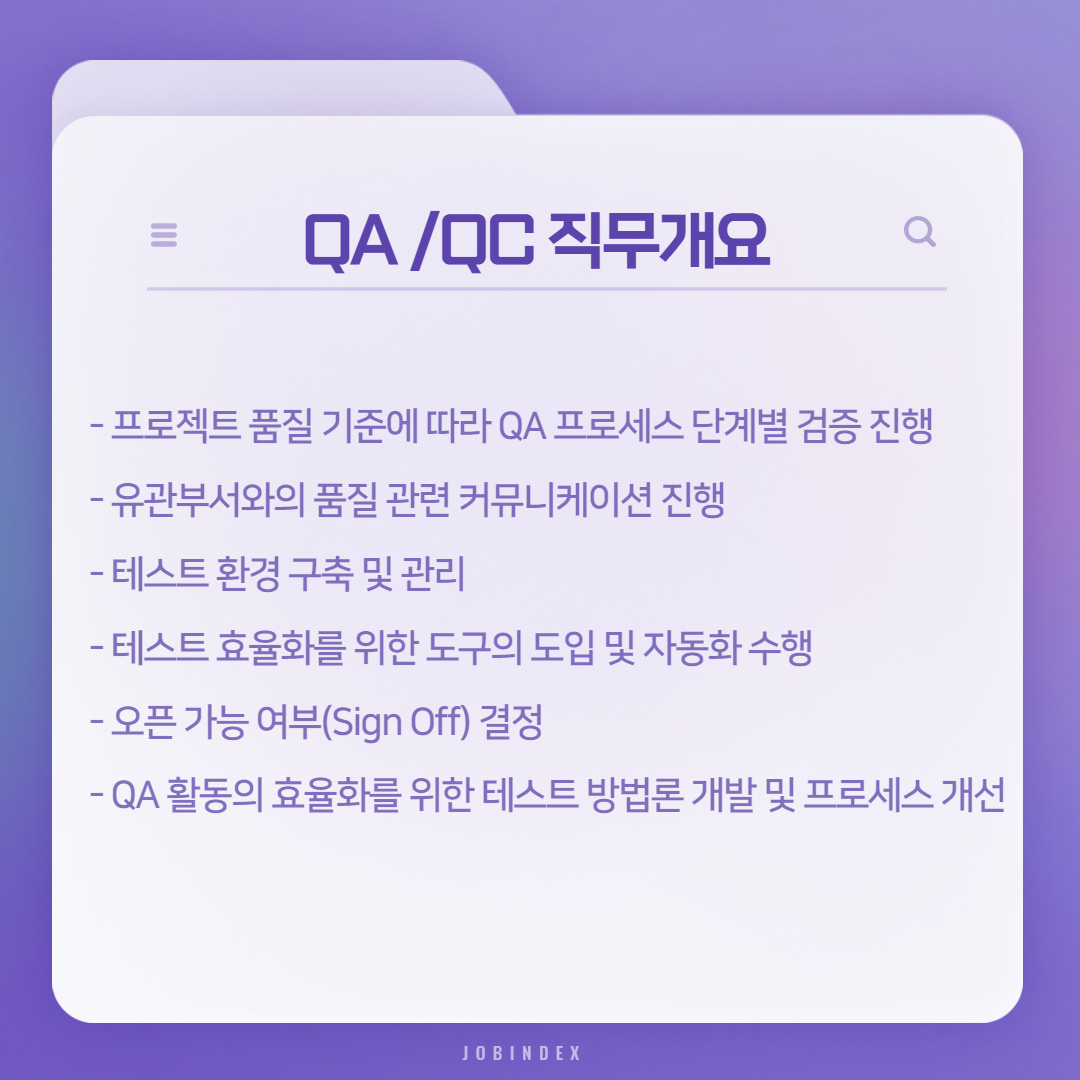 QA/QC 업무는 게임 콘텐츠 제작지원작 보다 더 완성도 높은 출시를 위해 오류를 수정하고 그에 대한 품질 점검을 지원하는 업무입니다.