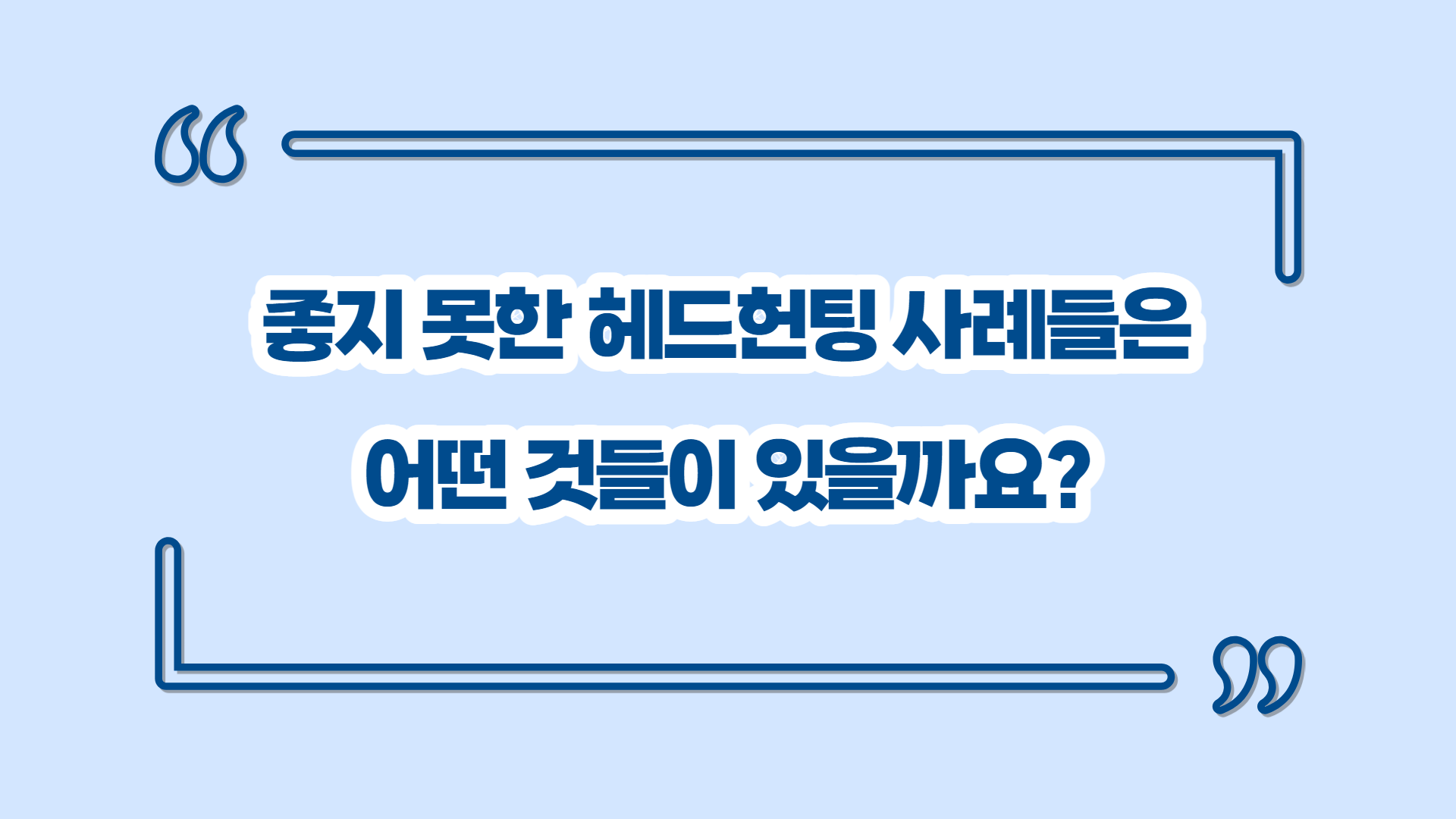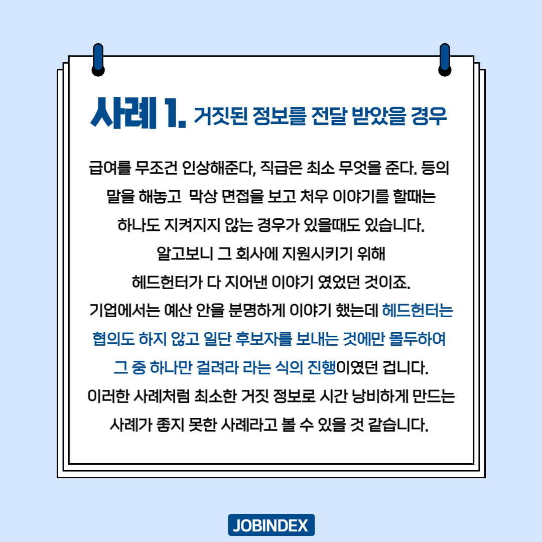 좋지 못한 헤드헌팅 사례들은 어떤 것들이 있을까요? 7,054 1 2 헤드헌팅을 통해 이직을 성공한 분들도 많으시겠지만 이직을 실패하셨거나 좋지 못한 경험을 하신 분들의 이야기가 궁금합니다. ☞ Q&A 보러가기 `21.07.07 다음글국내 증권사 순위가 어떻게 되나요? 이전글[직장생활] 직장인 매너리즘에서 탈출하는 방법