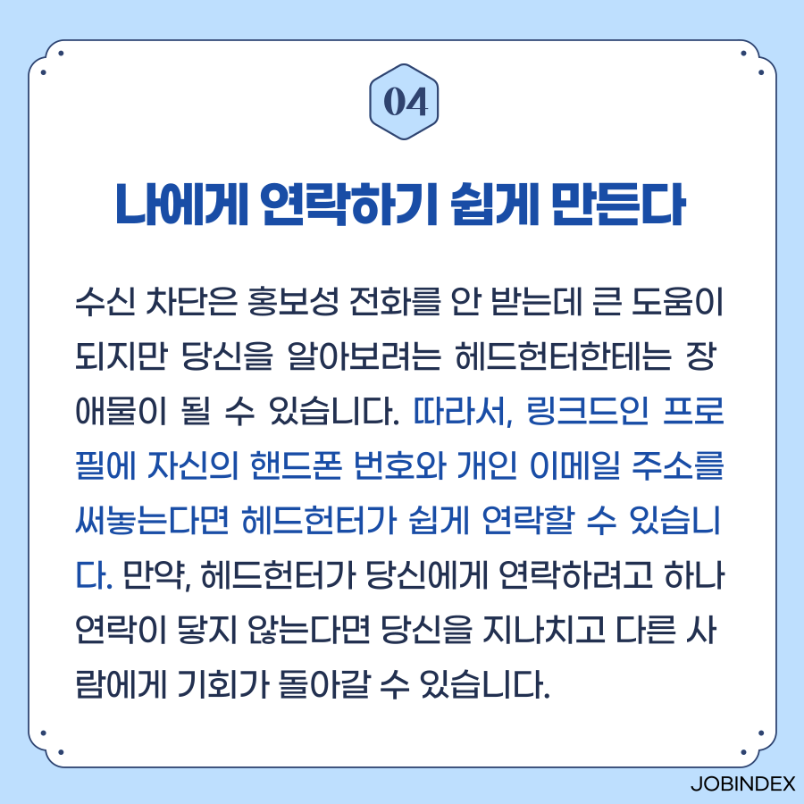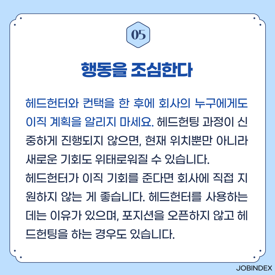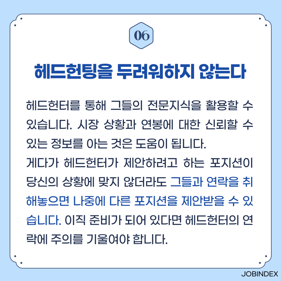 이직을 준비할 때, 헤드헌터를 통해 나의 연차와 능력에 딱 맞는 포지션을 추천받을 수 있습니다. 이렇게 헤드헌터의 도움을 받게 되면 이직이 조금 수월해질 수 있는데요, 그래서 준비한 주제는 '헤드헌팅 받는 6가지 방법'입니다. 다음의 6가지 방법을 잘 활용해서 헤드헌팅 받기를 바랍니다! 😉