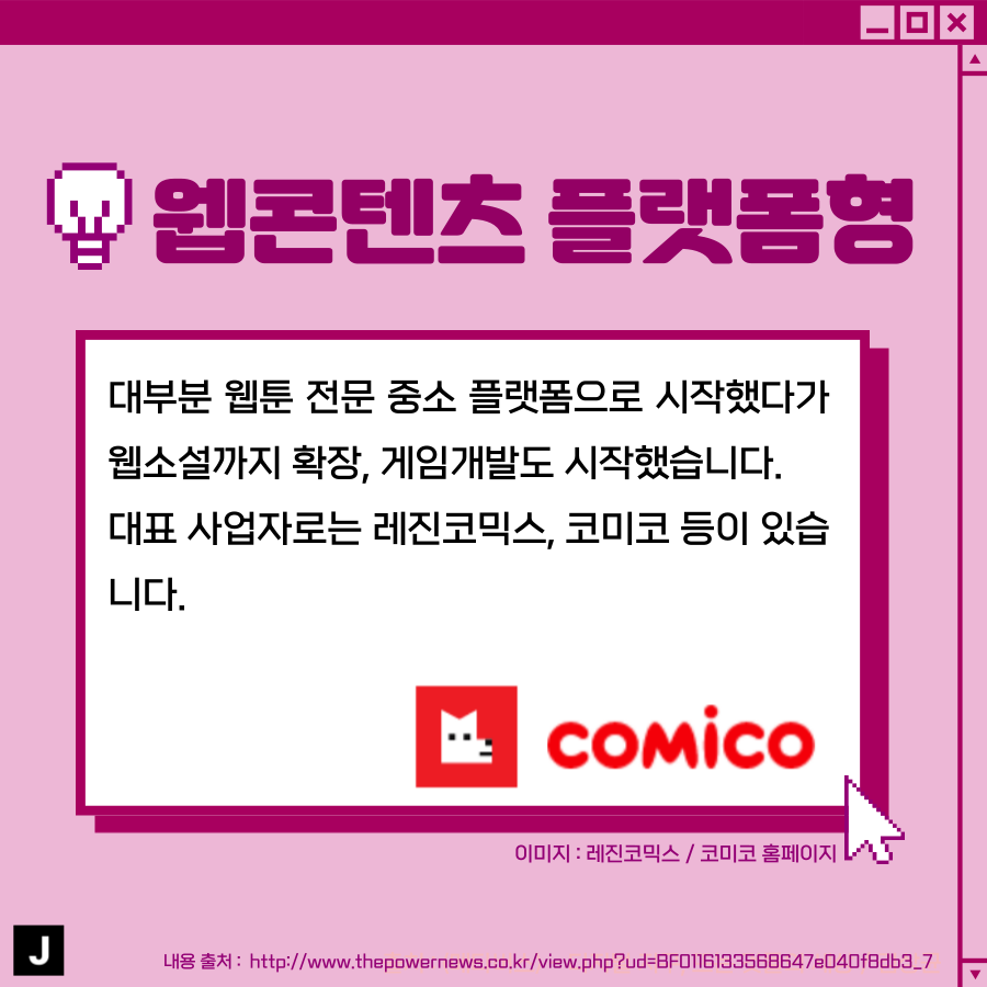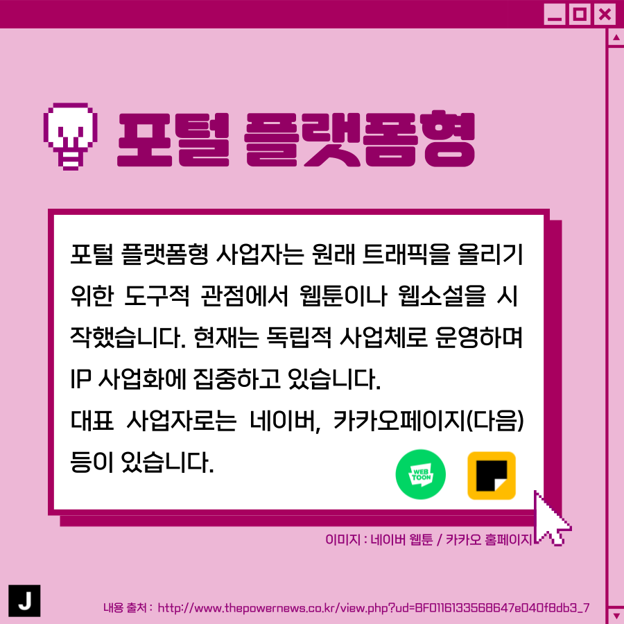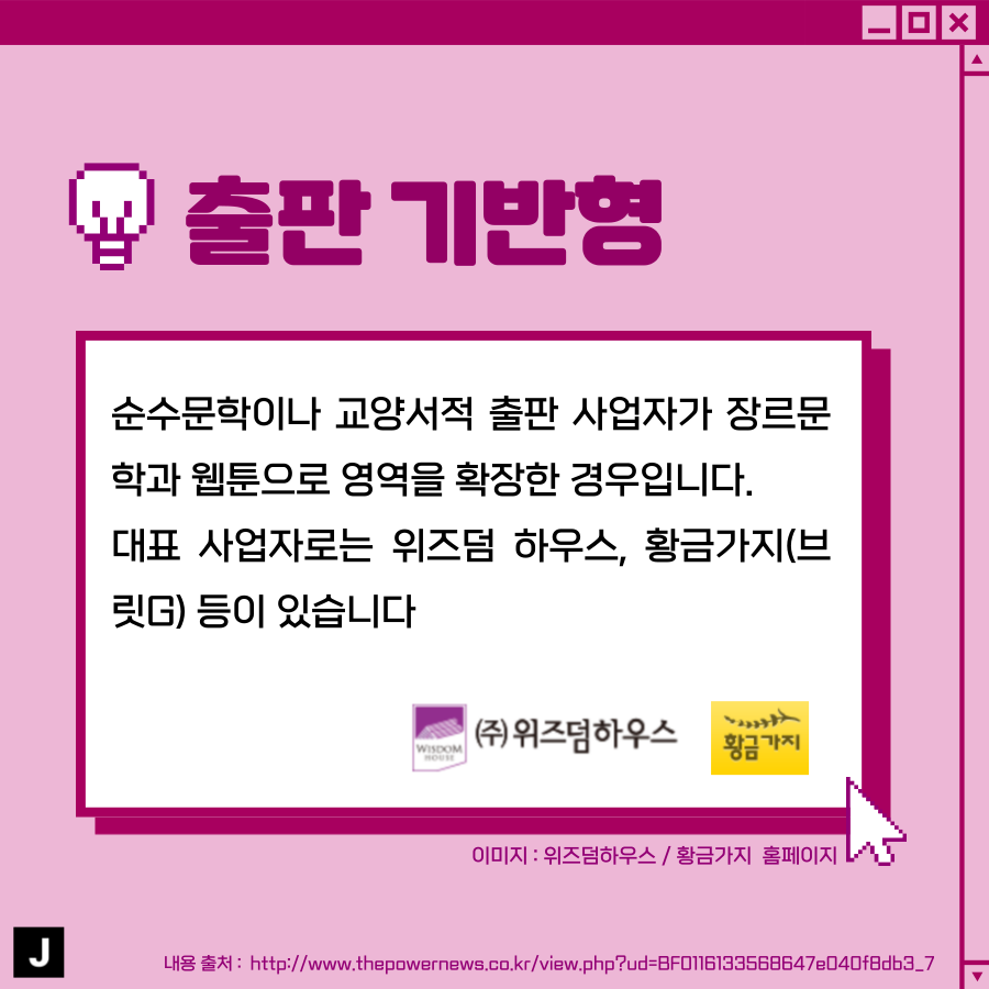 웹콘텐츠 IP 사업자는 각 사업자가 보유한 주력 자원에 따라 웹콘텐츠 분야 사업자를 5가지로 유형화할 수 있다고 합니다.