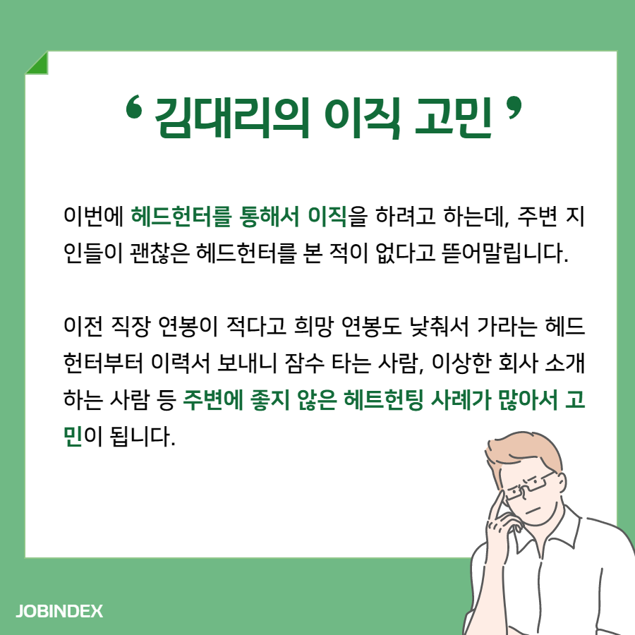 헤드헌팅을 통해 이직한 경험이 없는 사람이라면, 헤드헌팅이 생소하기도 하고 헤드헌터를 믿어도 될지 고민이 됩니다. 무엇보다 헤드헌팅의 좋지 않은 사례도 있어 망설이게 됩니다.