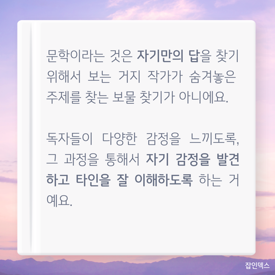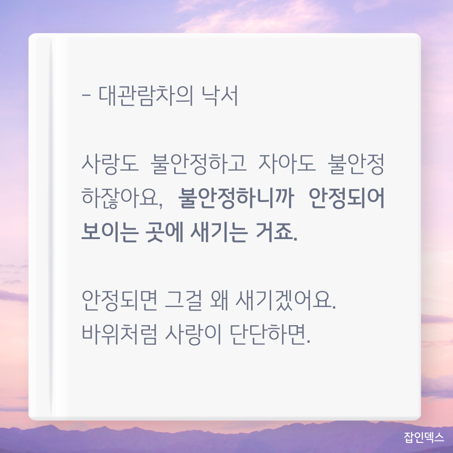 공감이 가는 김영하 작가의 알쓸신잡 어록 7,204 2 2 김영하 작가는 알쓸신잡에 출연하면서 시청자들의 공감을 자아내는 말을 남겼습니다. 공감이 가는 김영하 작가의 알쓸신잡 어록 한 번 들어볼까요?😉 새로운 기회의 시작 JOBINDEX `21.08.05 다음글월클 배구 선수 식빵언니 김연경 명언 이전글명언 폭격기 강호동 어록