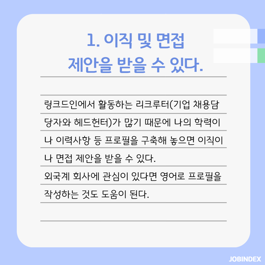 링크드인을 통해서 이직이나 면접을 제안받을 수 있고, 다양한 산업에 대한 인사이트를 얻는 등 링크드인의 다양한 활용방법이 있는데요, 오늘은 링크드인 활용을 추천하는 사람과 경력직들이 왜 링크드인을 사용하는지 알아보겠습니다!