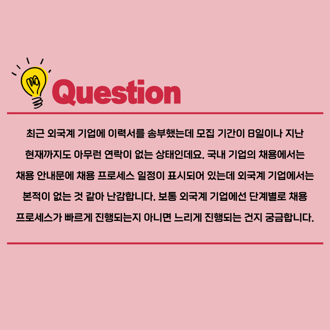 국내 기업의 채용에서는 채용 안내문에 채용 프로세스 일정이 표시되어 있는데 외국계 기업에서는 본적이 없는 것 같아 난감합니다.