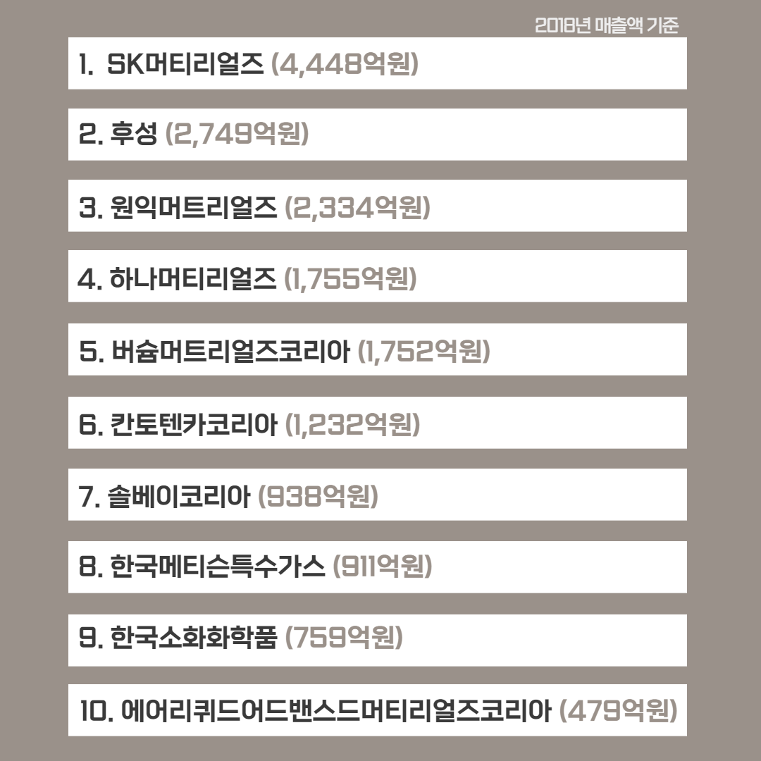 국내 특수가스 공급업체들 중 매출 확인이 가능한 기업을 대상으로 매출액 순위를 알아보겠습니다.