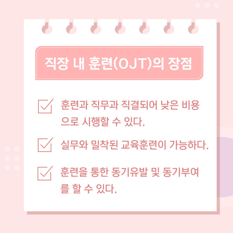 각 훈련 방법마다 장점과 단점이 있기 때문에 어느 것이 좋은 훈련 방법이라고 할 수는 없으나 각 산업 및 직장의 특성에 따라 훈련 방법을 선택하는 것이 좋을 것 같습니다!