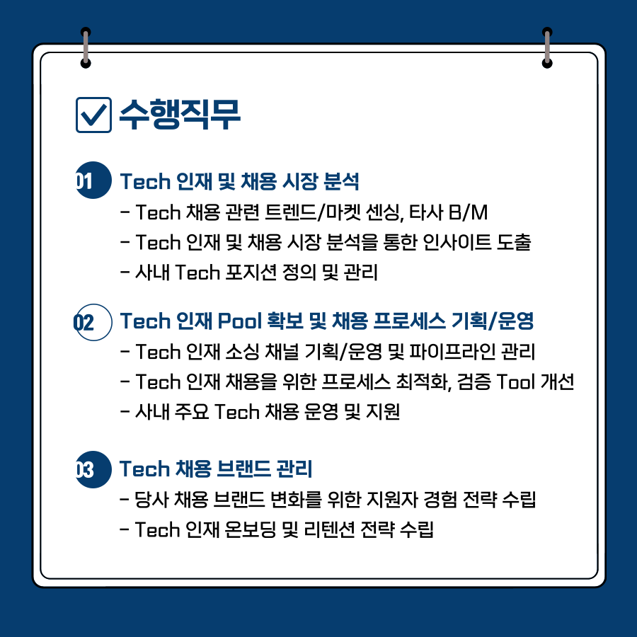 Tech 인재 확보를 위하여 HR 분야에서도 개발직군에 중점은 둔 채용 담당자인 테크 리크루터(Technical Recruiter)를 활용하고 있으며, Tech채용 기획 및 운영을 전담하는 인력을 모집하여 개발자 채용에 대한 고민을 해소하고 노력하고 있습니다.