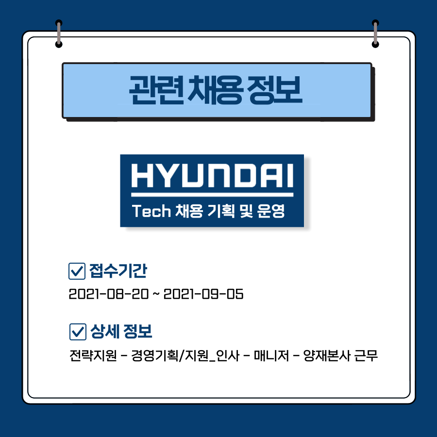 👉 현대자동차 Tech 채용 기획 및 운영 지원하러 가기!