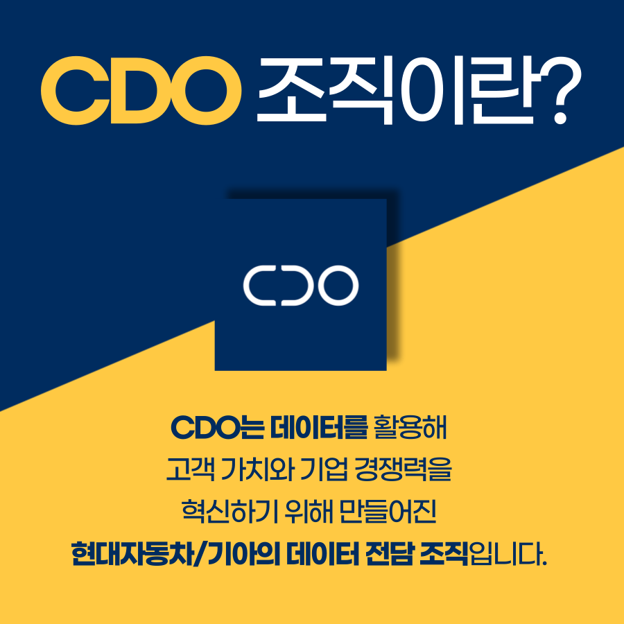 현대 자동차와 기아 자동차는 효과적인 데이터 활용을 위해 빅데이터/AI 분석 활동으로 데이터 기반 가치 창출을 추진하는 CDO(Chief Data Office) 사업부를 만들었습니다.