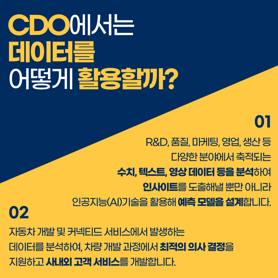 더 좋은 차를 만들기 위해 완성차 회사에서는 빅데이터를 활용하여 예측 모델을 만들고 다양한 서비스에 도입하고 있는데요, 이번에는 CDO 조직은 데이터를 어떻게 활용하는지와 관련 채용 공고까지 살펴보겠습니다!