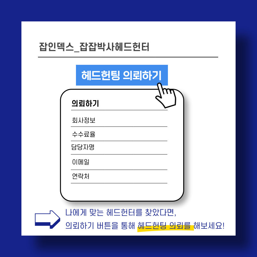 잡인덱스에서 헤드헌터 찾기를 통해 나와 잘 맞는 헤드헌터를 찾고, 헤드헌팅 의뢰까지 할 수 있습니다.